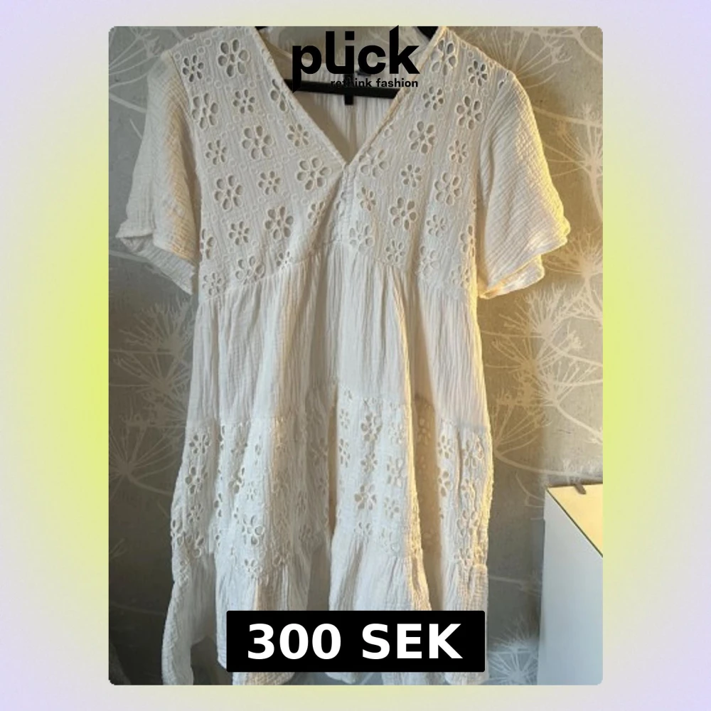 Söt vit kortklänning med v-ringning och korta ärmar. Klänningen har broderade blommor och volangdetaljer. Luftig och bekväm, perfekt för varma dagar! Kan passa som studentklänning❗️