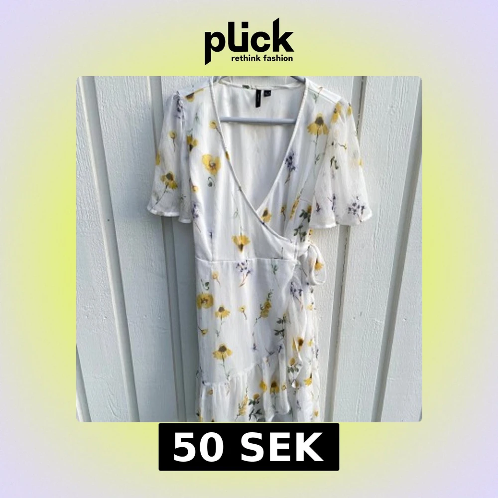 Superfin vit omlottklänning från Vero Moda med blommigt mönster i gult och lila. Klänningen har korta ärmar, volangdetaljer och knyt i midjan. Perfekt för varma dagar och har en luftig känsla. Säljes i storlek M.