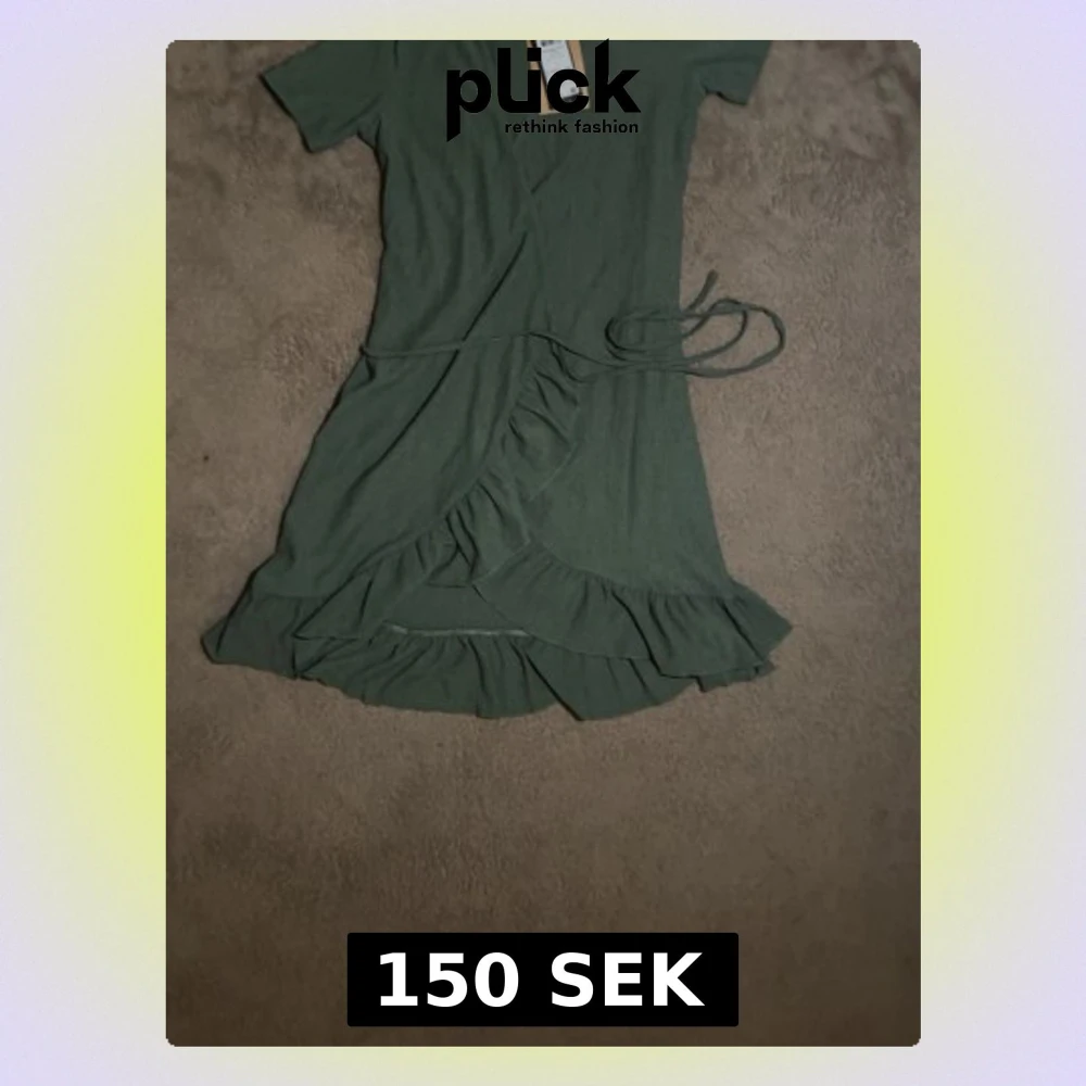 Snygg grön kortklänning i omlottmodell med volangdetaljer längs nederkanten och knytband i midjan. Perfekt för dig som gillar en enkel men trendig stil. Kortärmad och i mjukt material som känns skönt mot huden.