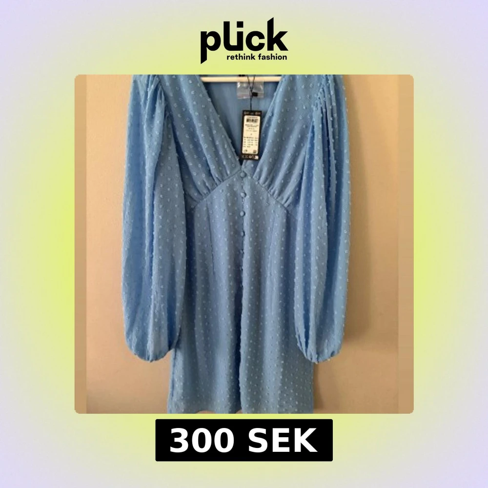 Supersöt ljusblå klänning med lång ärm och v-ringning från Veromoda med lappen kvar , Klänningen har små prickar i tyget, knappar framtill och lätt puffade ärmar. Perfekt för vår och sommar!