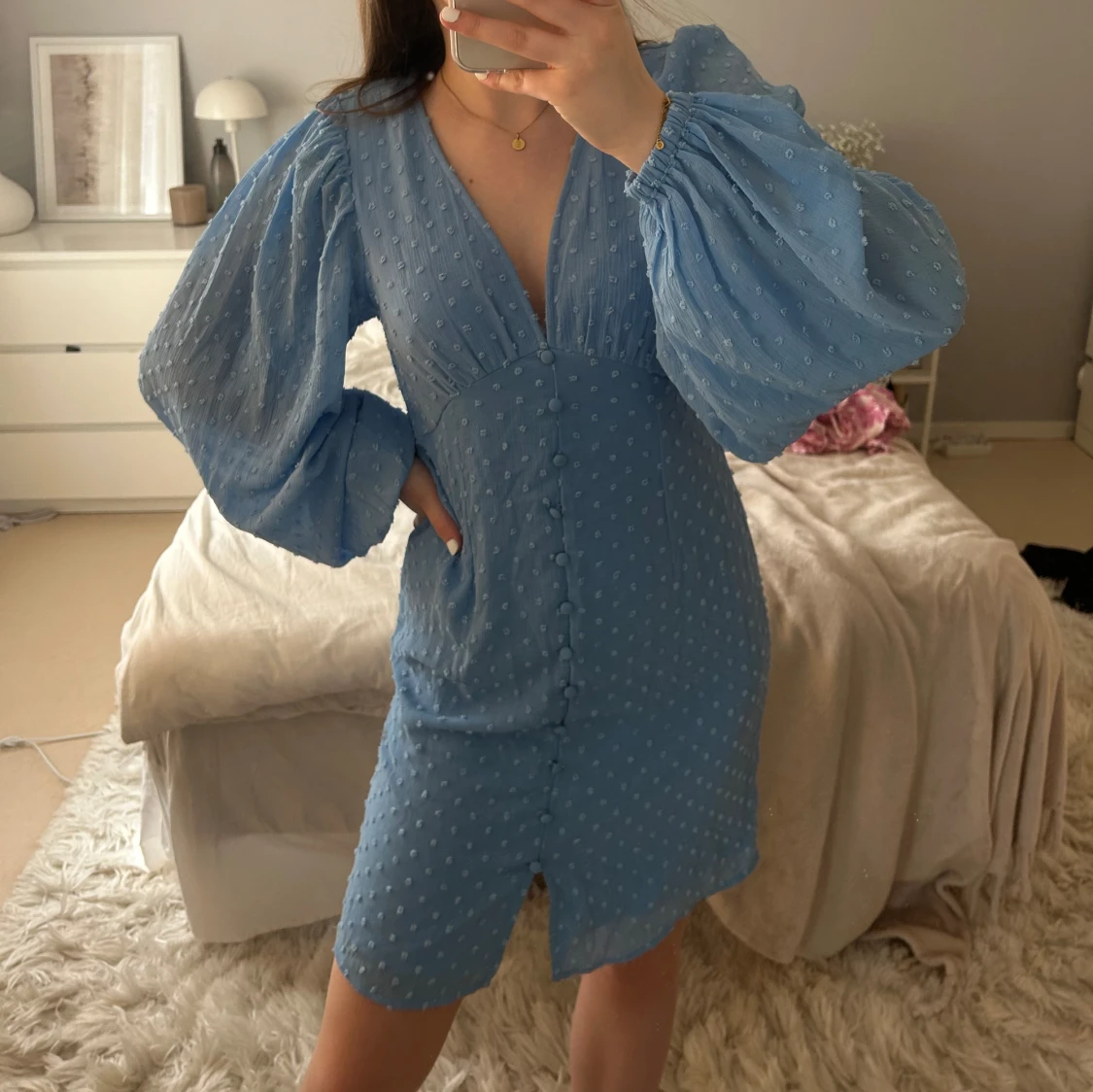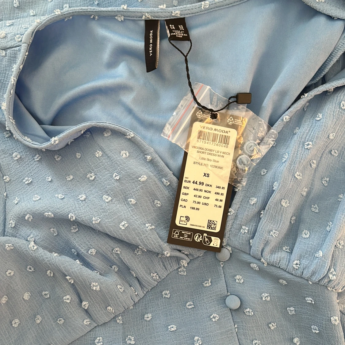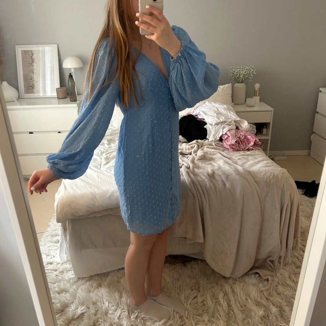 En jättefin blå klänning i ganska stark blå färg så man ser extra brun ut på sommaren 💙 aldrig använd, är i xs passar bra på mig som har S