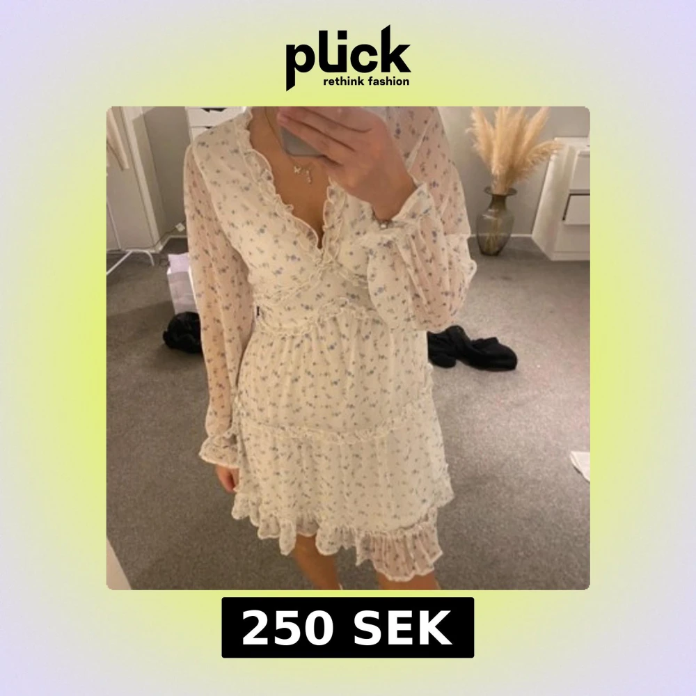 Aldrig använd, Romantisk vit klänning med små blå blommor, volangdetaljer och v-ringning. Långa, transparenta ärmar och markerad midja. Perfekt för vår och sommar. Lätt och luftig känsla.