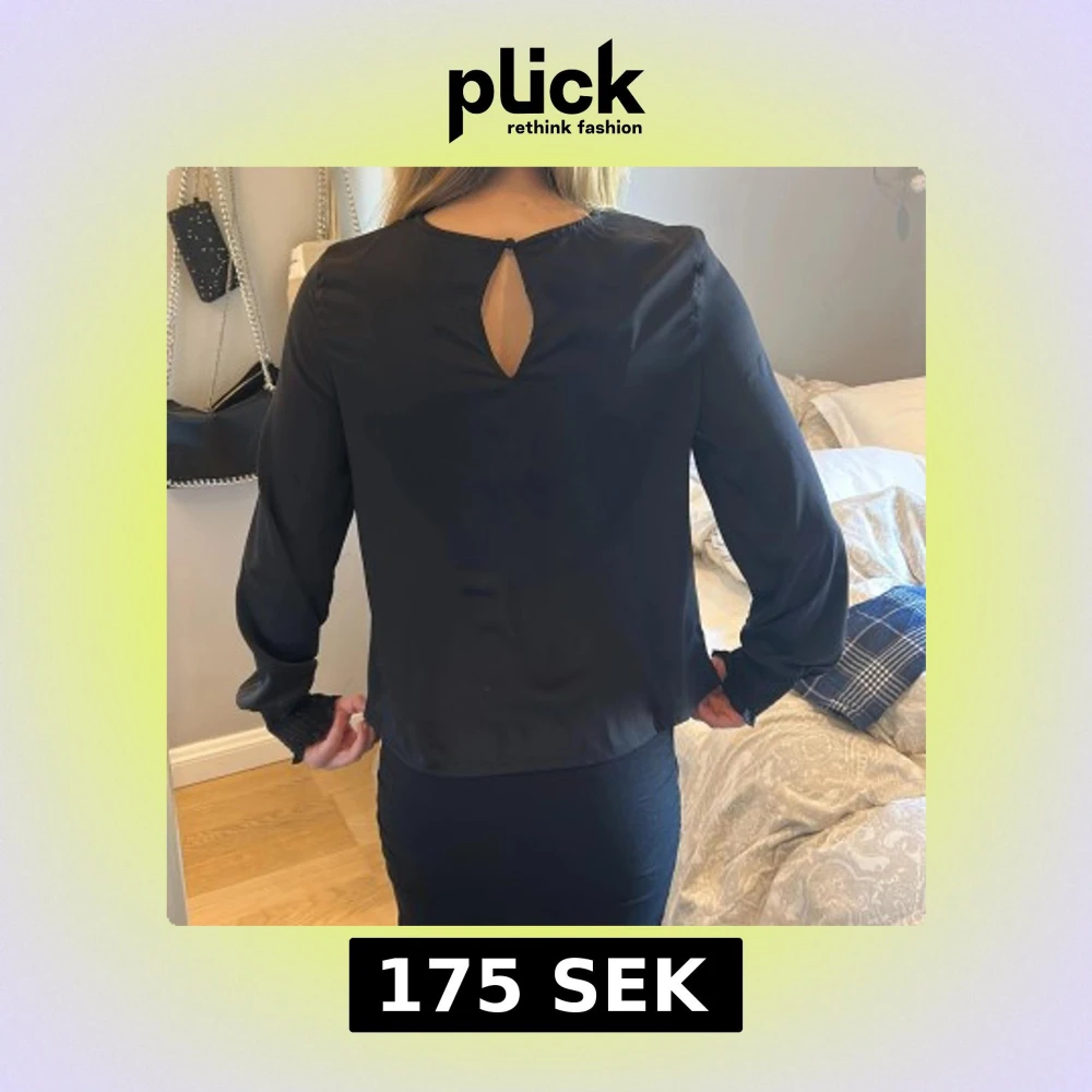 Elegant svart blus med långa ärmar och rund halsringning. Blusen har en liten öppning i ryggen och elastiska ärmslut för en bekväm passform. Säljer för den är för liten!💓
