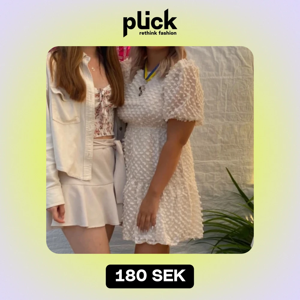 Säljer denna super söta klänning, den är vit men mer kräm vit vilket e jätte fint. Passar perfekt till student, andra mottagningar eller ba en söt sommar klänning 🤍 passar från xs-m då den e stretchig