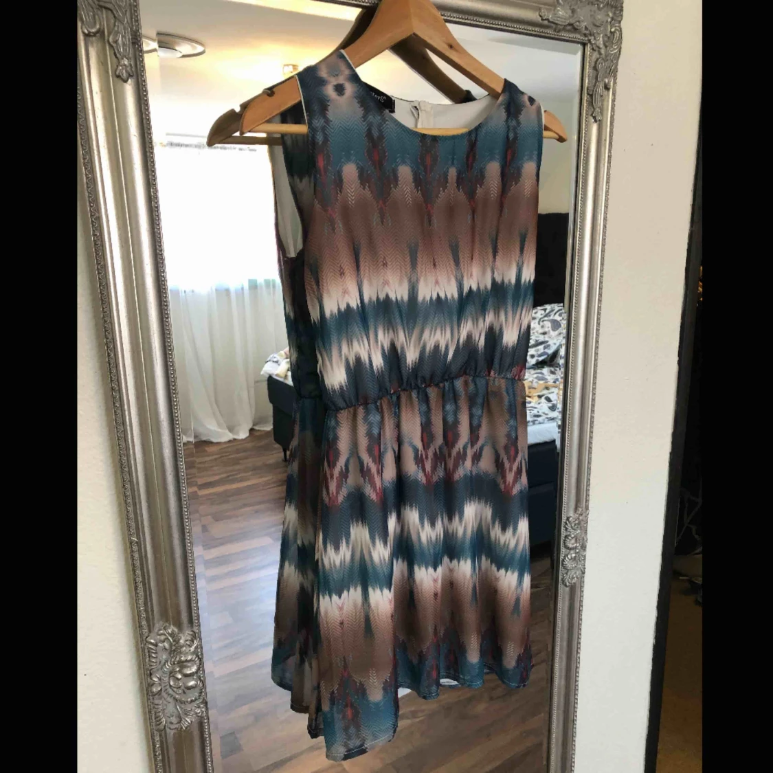 Klänning med fint mönster och ”gummiband” i midjan. Klänningen är kort.