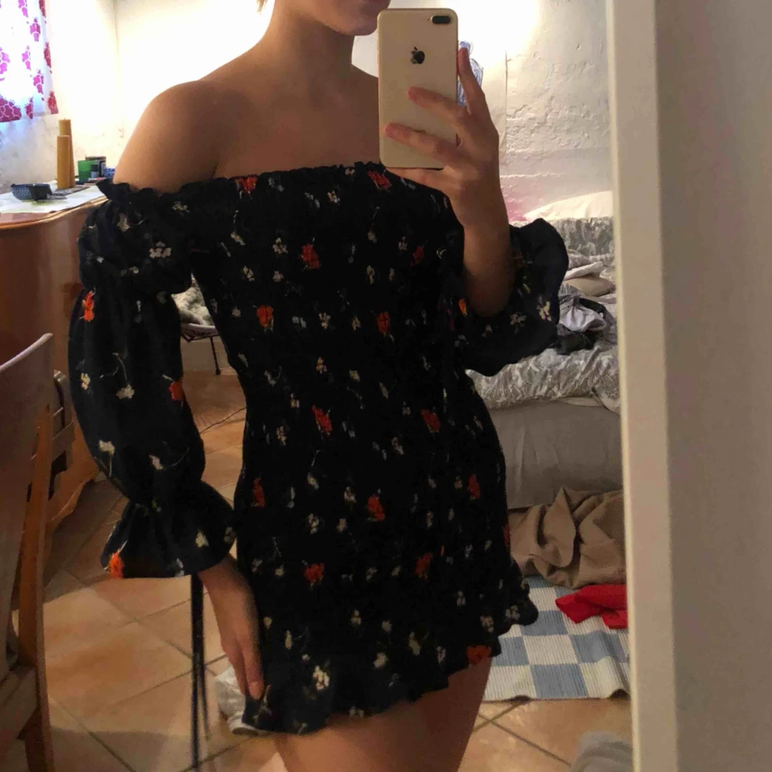 en klänning men använder som tröja (för kort för mig jag är 175-180cm), off shoulder med fina knyten i ärmarna