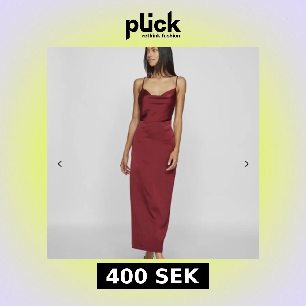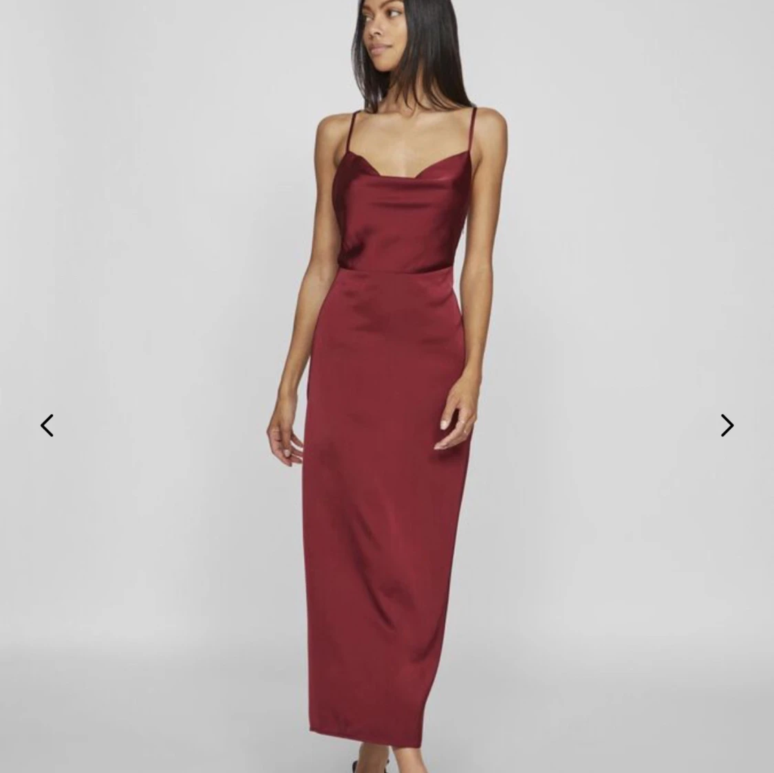 Vinröd långklänning i satinliknande material med smala axelband och figurnära passform. Klänningen har en elegant, enkel design med lätt draperad urringning och slät kjol. Perfekt för dig som vill ha en stilren och chic look. Använd en gång, nypris 459!