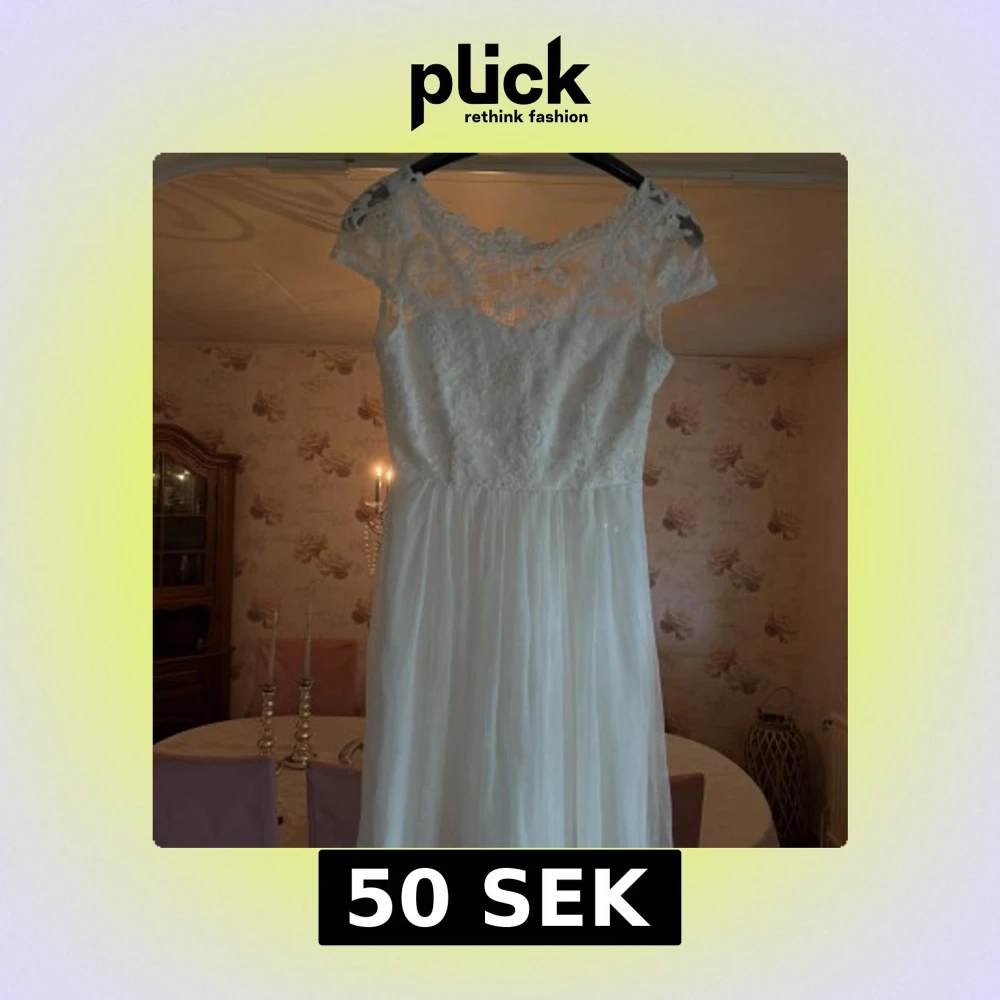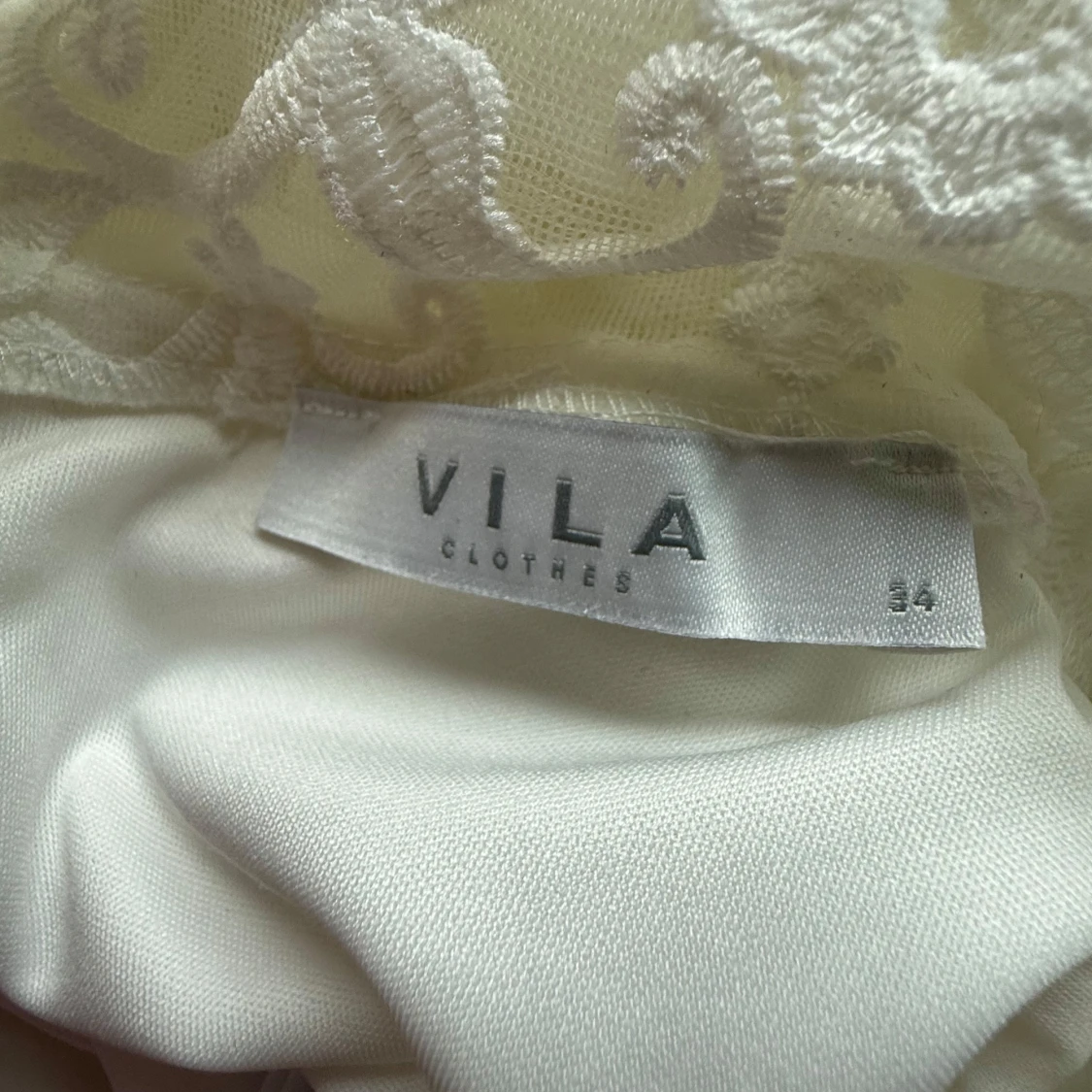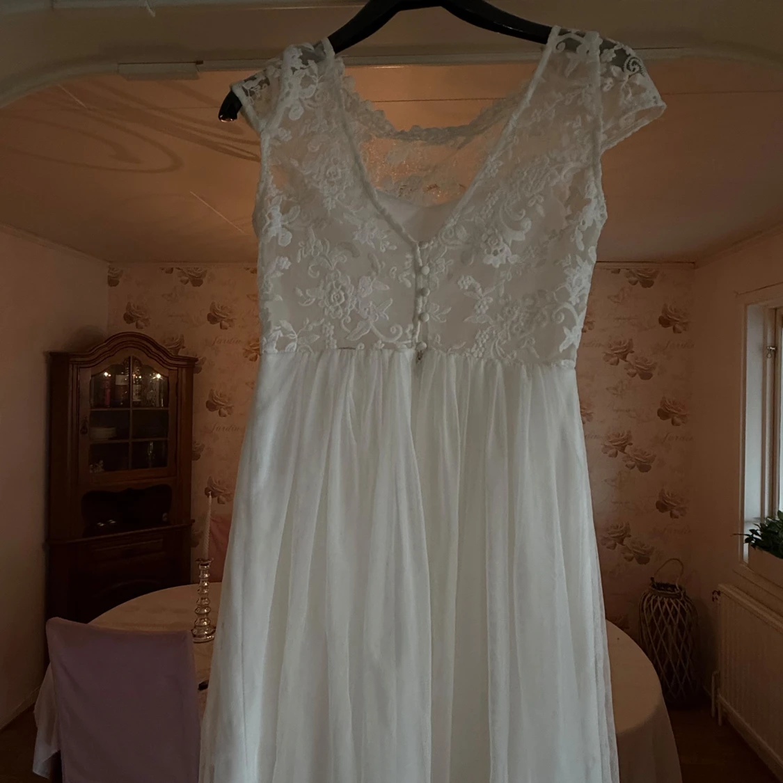 Superfin vit långklänning från Vila med spets upptill och vackra knappar i ryggen. Klänningen har korta ärmar, rund halsringning och ett flowy kjolparti i tunt tyg. Perfekt för dig som vill ha en romantisk och elegant look.