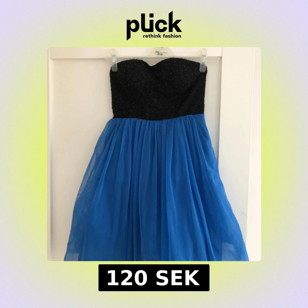 Säljer en snygg axelbandslös klänning med svart glittrig överdel och vid blå kjol i tyll. Perfekt för dig som vill sticka ut med en färgstark look. Kjolen är luftig och ger en fin siluett.