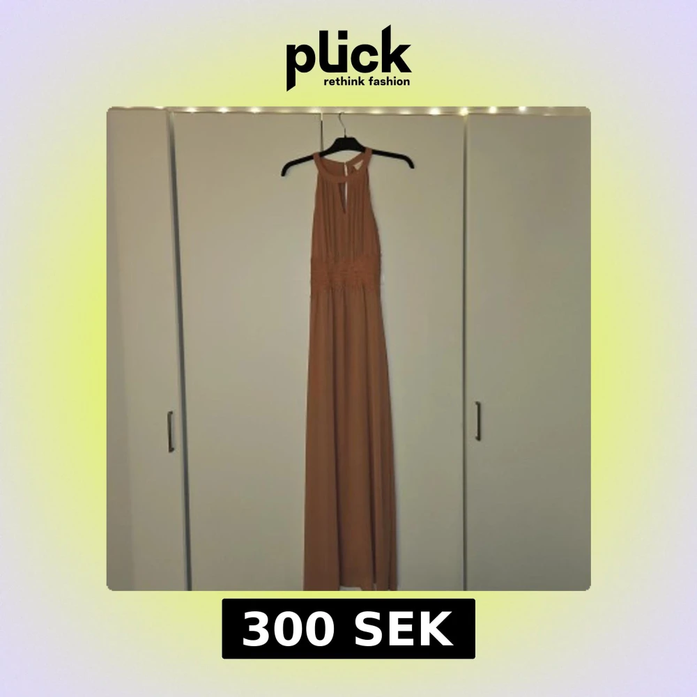 Säljer en elegant beige långklänning med vackra spetsdetaljer i midjan och hög halsringning. Klänningen är ärmlös och har en lätt, flowy passform som ger en stilren och sofistikerad look.