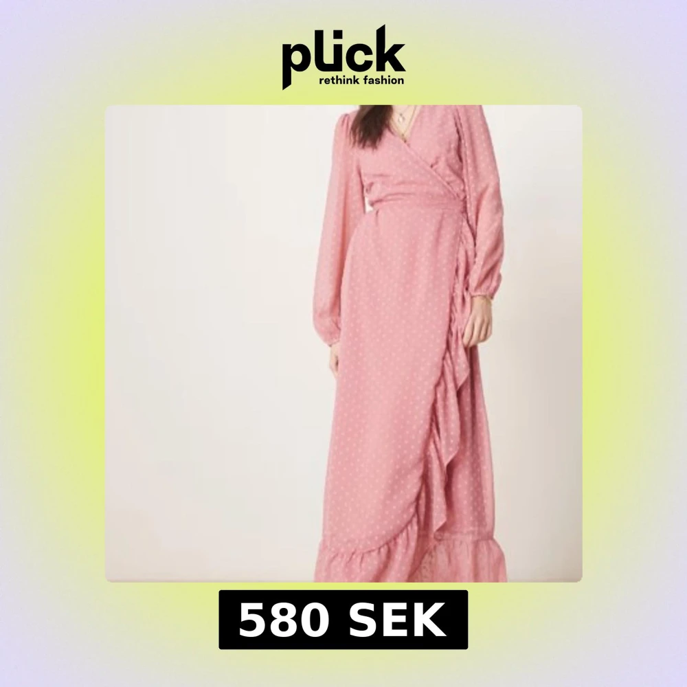 Rosa omlottklänning från Vila med prickigt mönster, volangkant nertill och långa ärmar. Klänningen har v-ringning och knyt i midjan för en snygg passform. Helt ny med prislappar kvar!