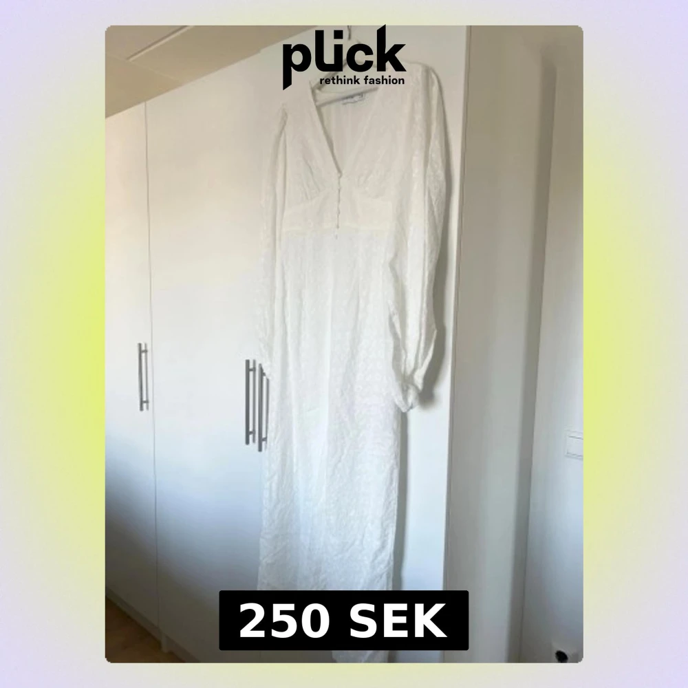 Elegant vit långklänning med v-ringad hals och knappar framtill. Klänningen har långa ärmar och ett diskret mönster i tyget som ger en romantisk känsla. Perfekt för sommarens speciella tillfällen.