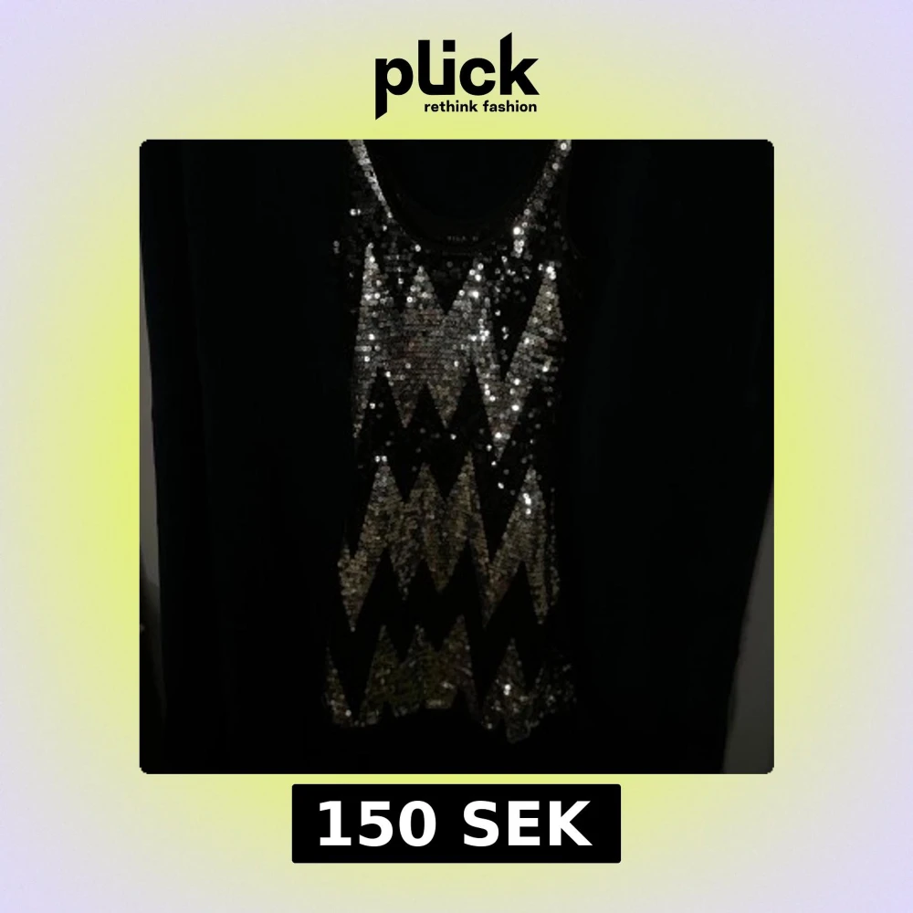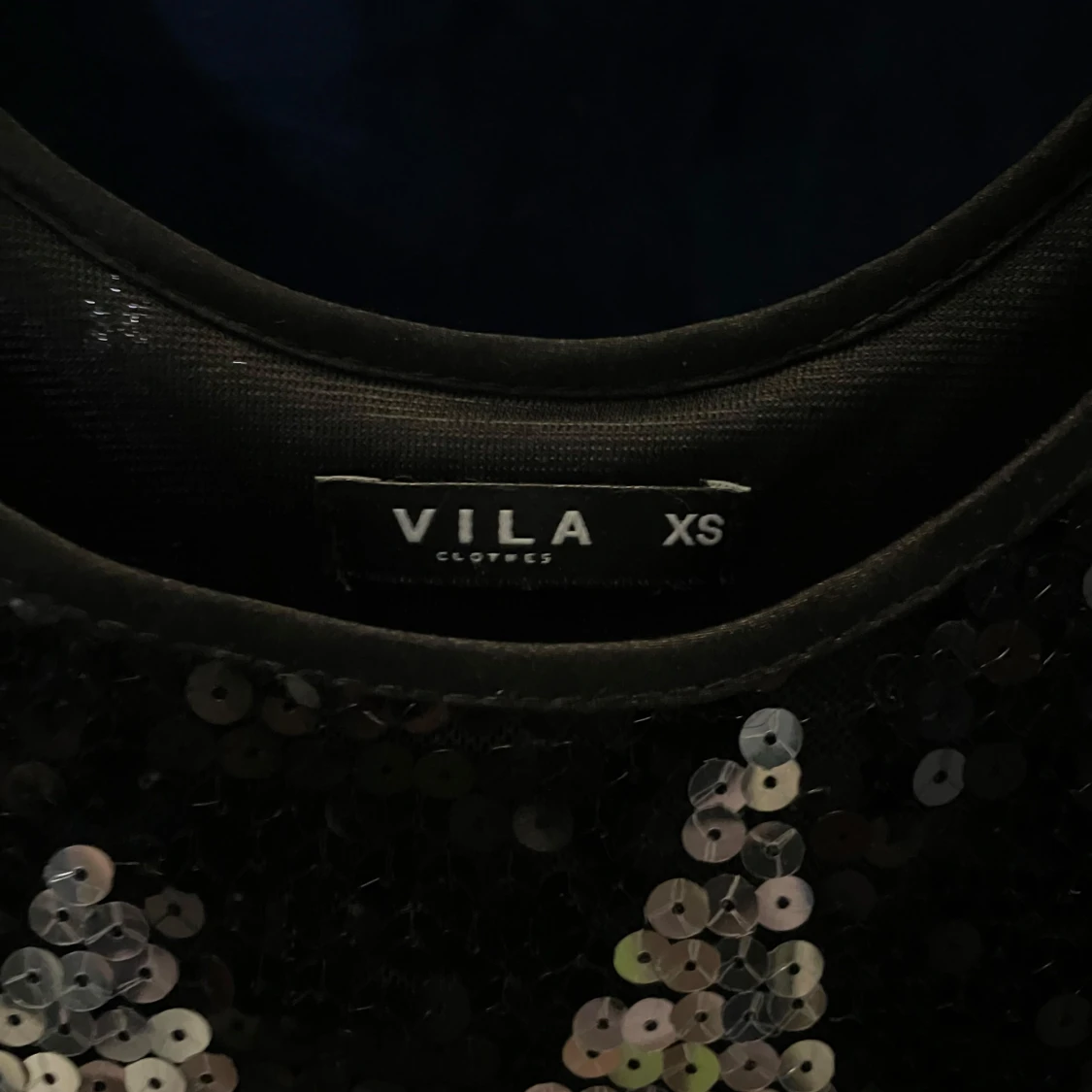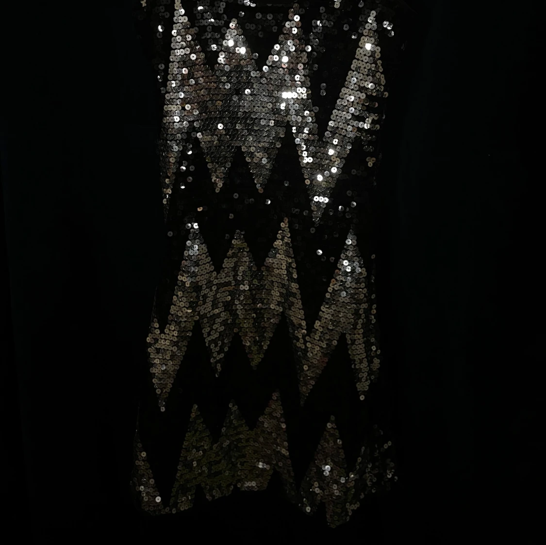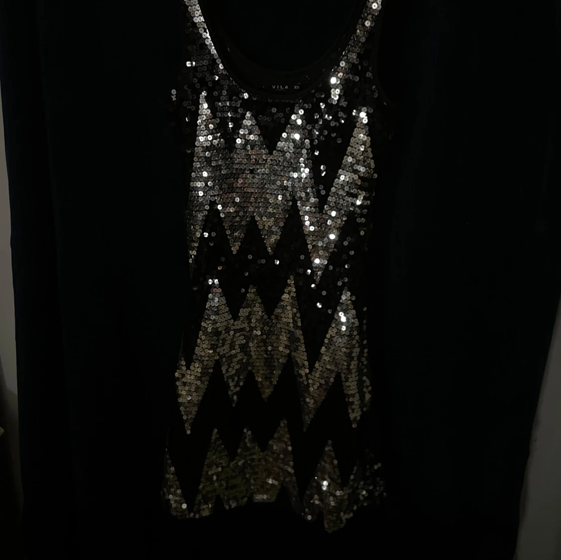 Snygg svart klänning från Vila i storlek XS, täckt med glittriga paljetter i ett zigzag-mönster. Perfekt för en festlig kväll med sin iögonfallande design.