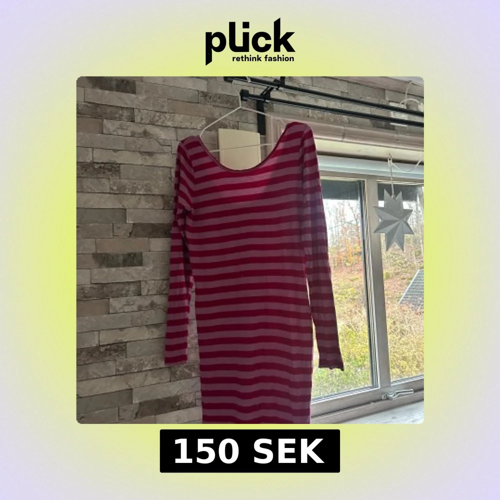 Säljer en cool långärmad klänning med breda horisontella ränder i rött och rosa. Klänningen har en rundad, djup urringning både fram och bak och är i en mjuk, tunn bomullskvalitet. Passformen är normal och längden går till strax ovanför knäna. Perfekt för dig som gillar färg och mönster!