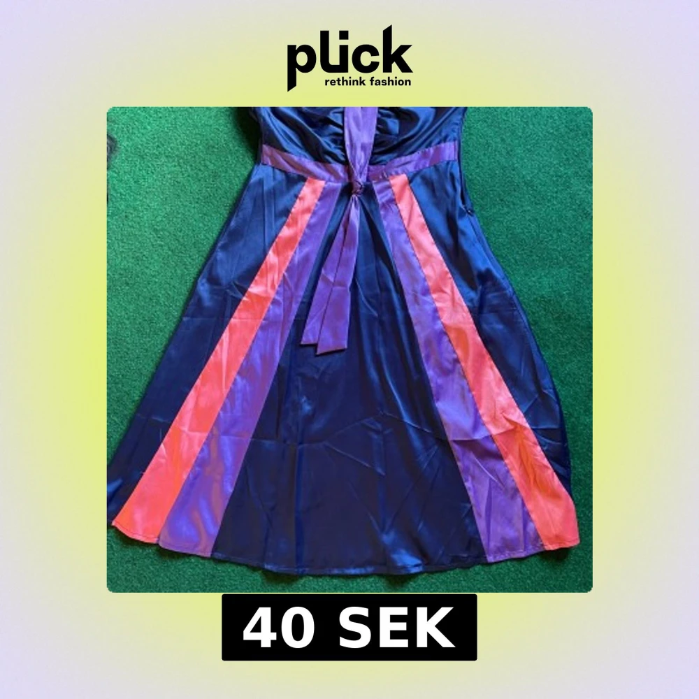 Snygg klänning från Vila i glansigt material med marinblå bas, lila och röda paneler samt knytband i nacken. Klänningen har en elegant A-linjeform och är perfekt för dig som vill sticka ut med färg och stil.