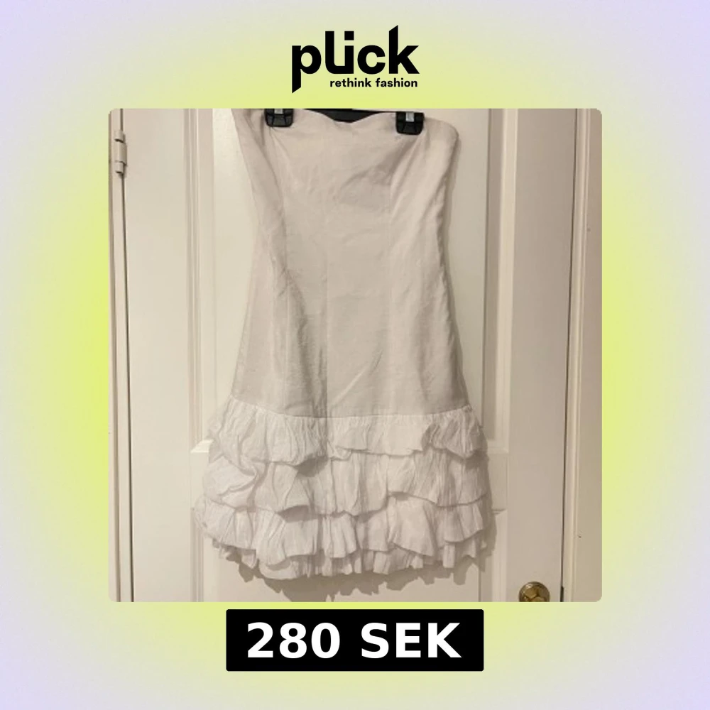 Säljer en söt vit klänning från VILA med flera volanger nertill. Axelbandslös modell med kort längd, perfekt för sommarens tillfällen. Klänningen har en lätt glansig yta.