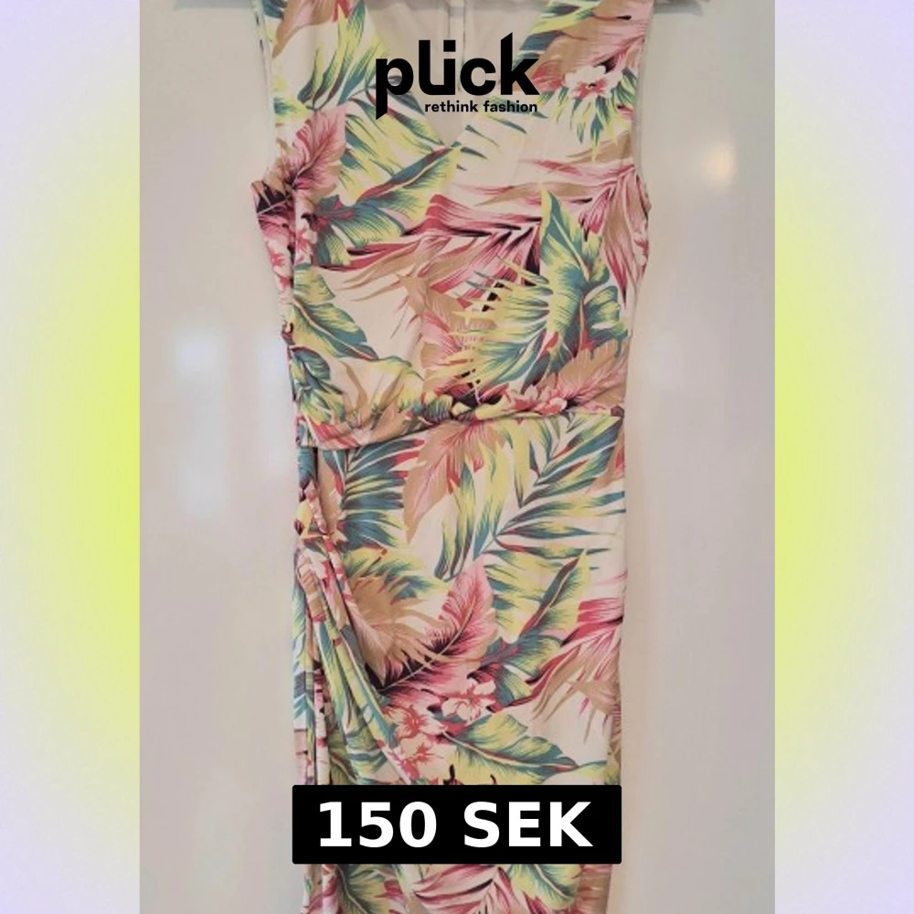 Snygg kortklänning från Vila med tropiskt blommigt mönster i rosa, grönt, beige och blått. Klänningen har v-ringning, omlott-detalj i kjolen och är ärmlös. Perfekt för sommarens alla tillfällen! Stretchig.