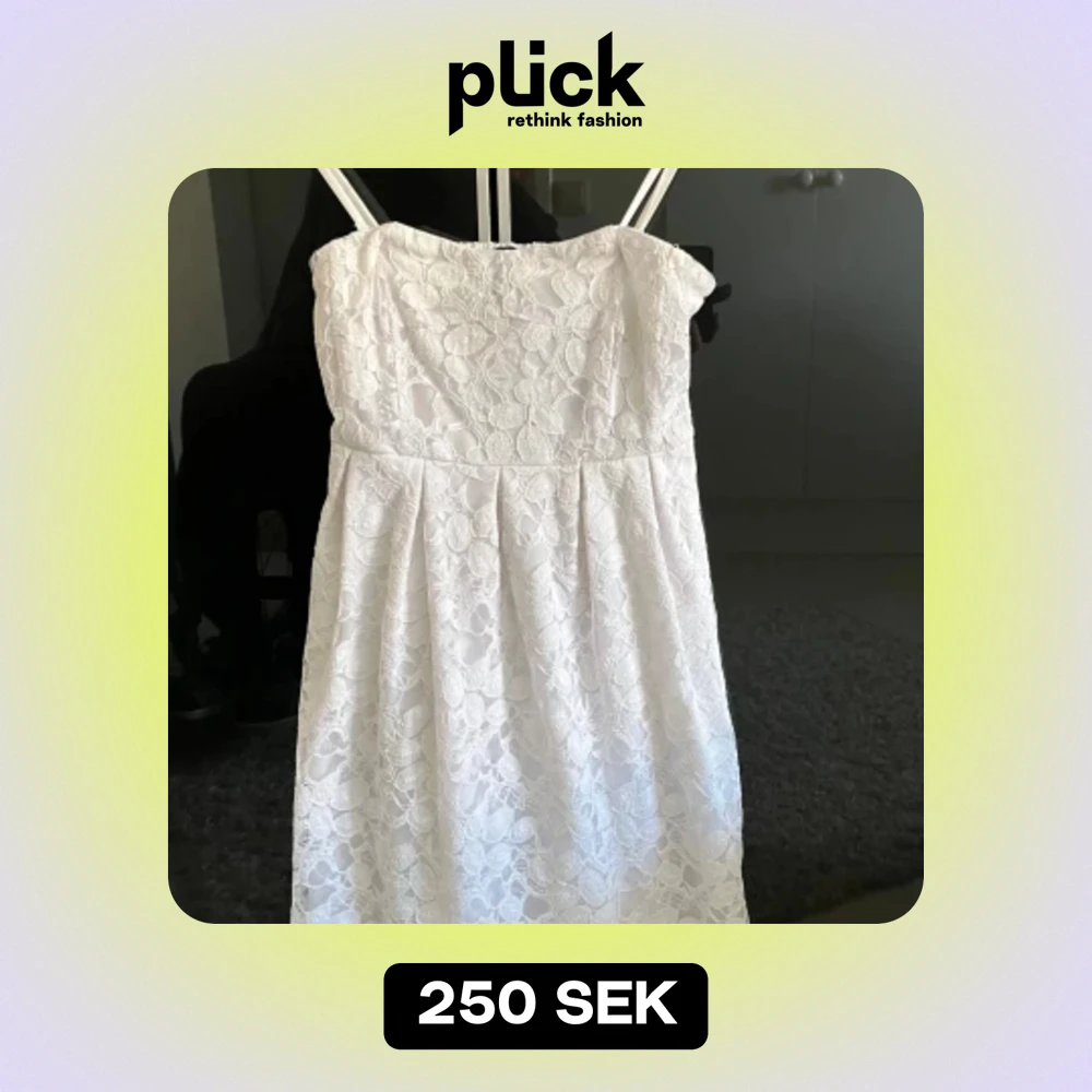 Spetsklänning med foder. Dragkedja i sidan. Resår bak i ryggen. Fickor i sidorna, syns ej. Använd en gång så i nyskick. St S, VILA