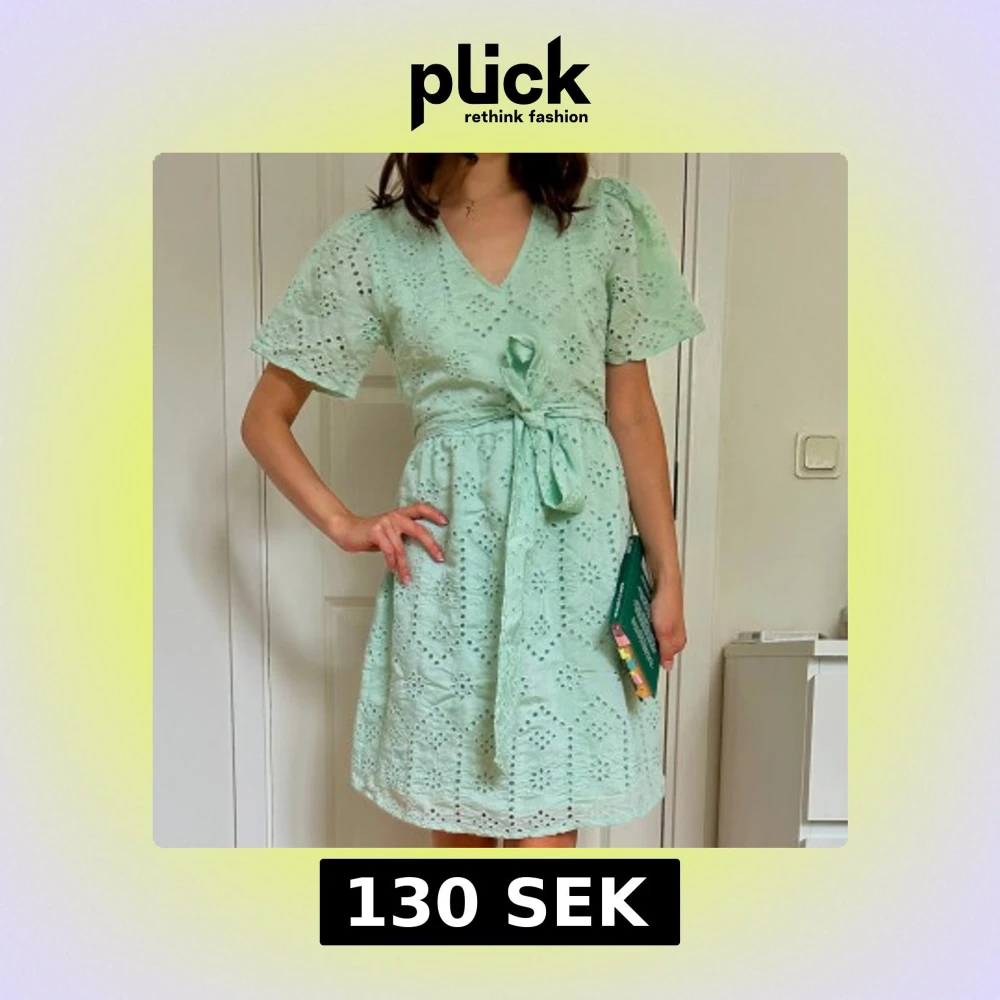 Säljer en ljusgrön kort klänning med v-ringning och knyt i midjan. Klänningen har broderade detaljer och ett fint hålmönster över hela tyget. Puffiga korta ärmar ger en söt och somrig vibe. Perfekt för dig som gillar romantisk och feminin stil💚