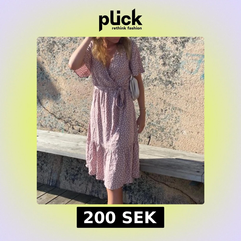 Superfin ljusrosa omlottklänning med vita prickar och knyt i midjan. Klänningen har korta ärmar, v-ringning och volang nertill. Perfekt för varma dagar och ger en söt och avslappnad look.