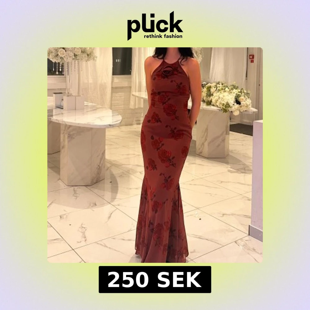 Supersnygg vinröd långklänning från Adoore med blommigt mönster och liten rosett framtill. Jättebra skick, använd endast en gång. Jag har sytt där fram vid bröstet. Perfekt nu inför nyår och julen. Originalpris 1600kr.
