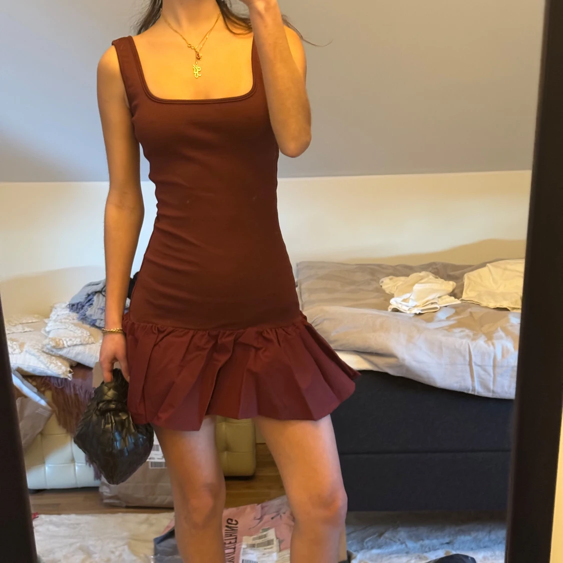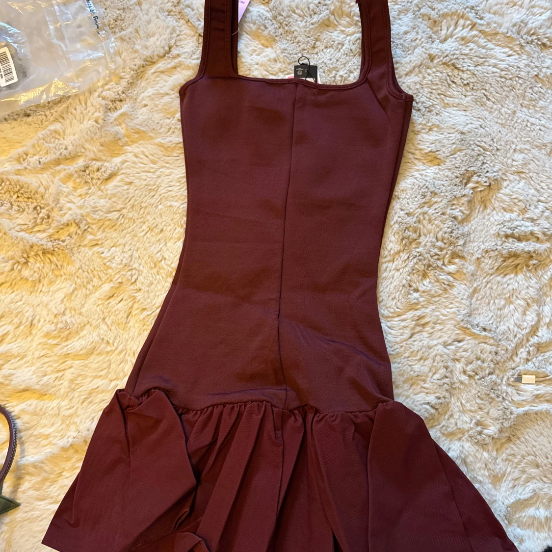 Snygg vinröd klänning med volangdetalj vid fållen Aldrig använd, lappar kvar , nypris 400kr.