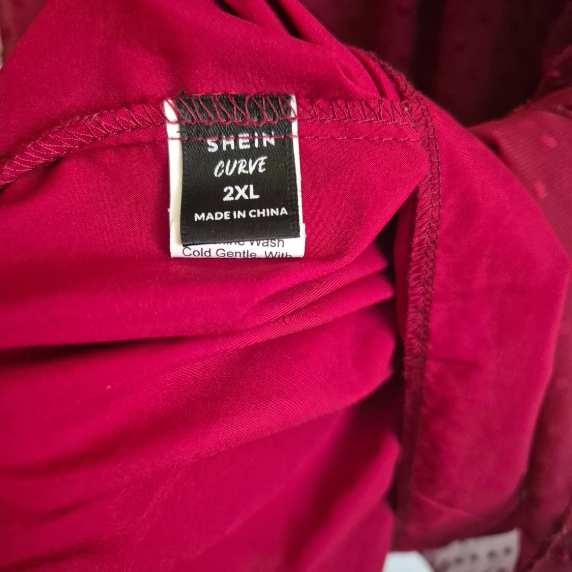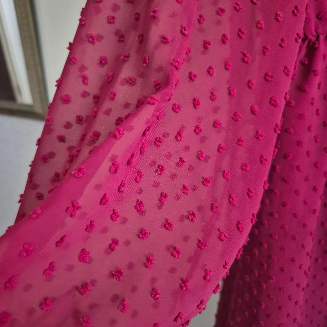 Superfin vinröd kortklänning från SHEIN Curve med omlott-v-ringning och långärmade transparenta ärmar. Klänningen har ett prickigt strukturmönster i tyget och är gjord i mjuk polyester. Perfekt för dig som gillar färg och vill sticka ut lite extra. Cool att dressa upp med boots och skinnjacka.