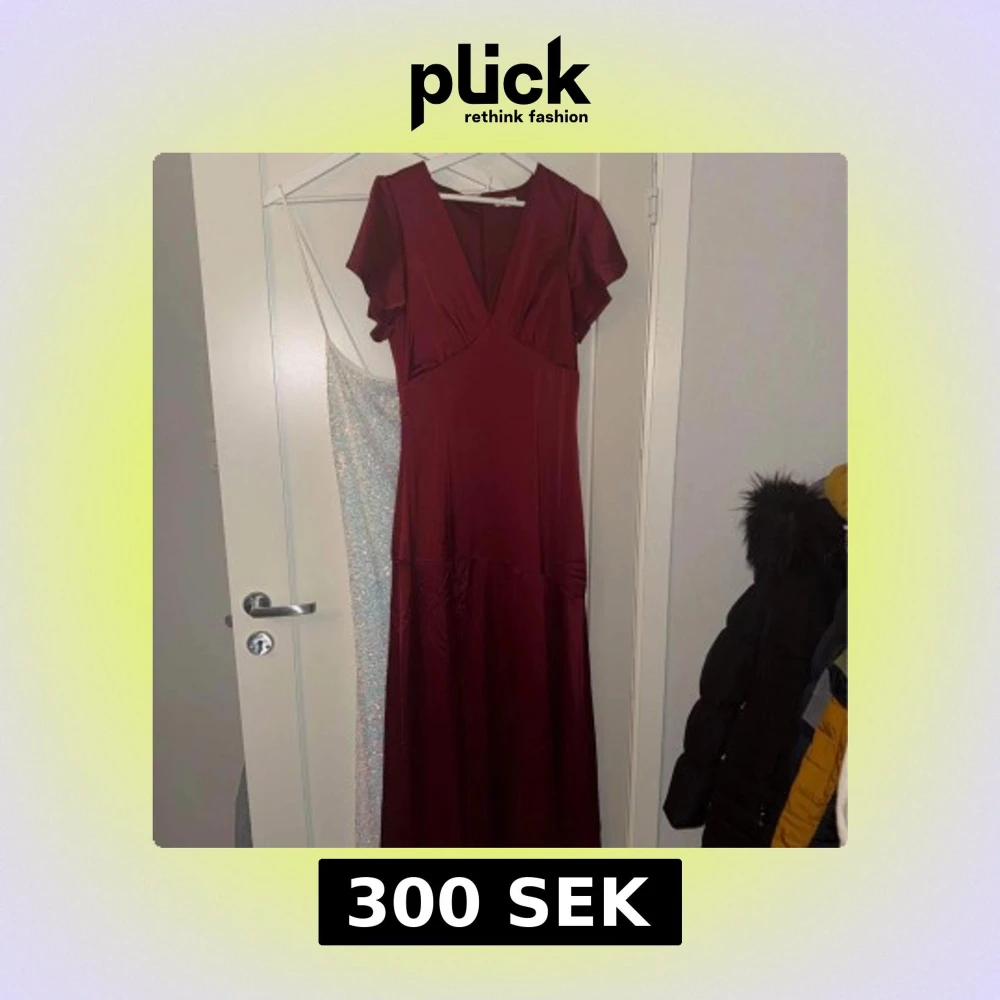 Säljer en vinröd långklänning från Bubbleroom med v-ringning och korta volangärmar. Klänningen har en elegant, flowy passform och är tillverkad i ett glansigt polyestertyg som ger en lyxig känsla. Perfekt för dig som vill sticka ut med en klassisk och stilren look.