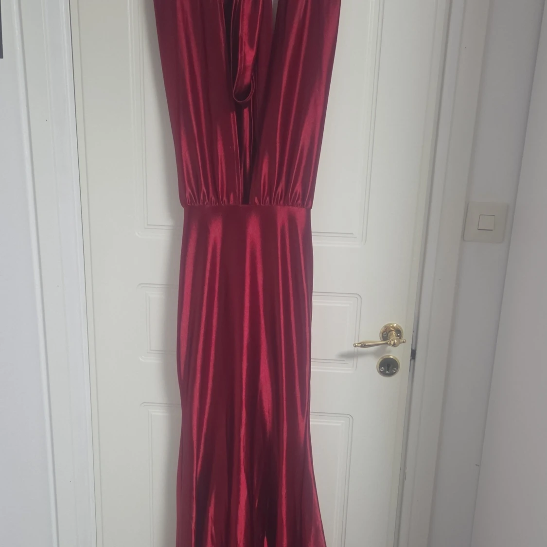 Snygg vinröd långklänning i glansigt satinmaterial med djup v-ringning och ärmlös design. Perfekt för dig som vill sticka ut med en elegant och stilren look. Klänningen har markerad midja och ett vackert fall.