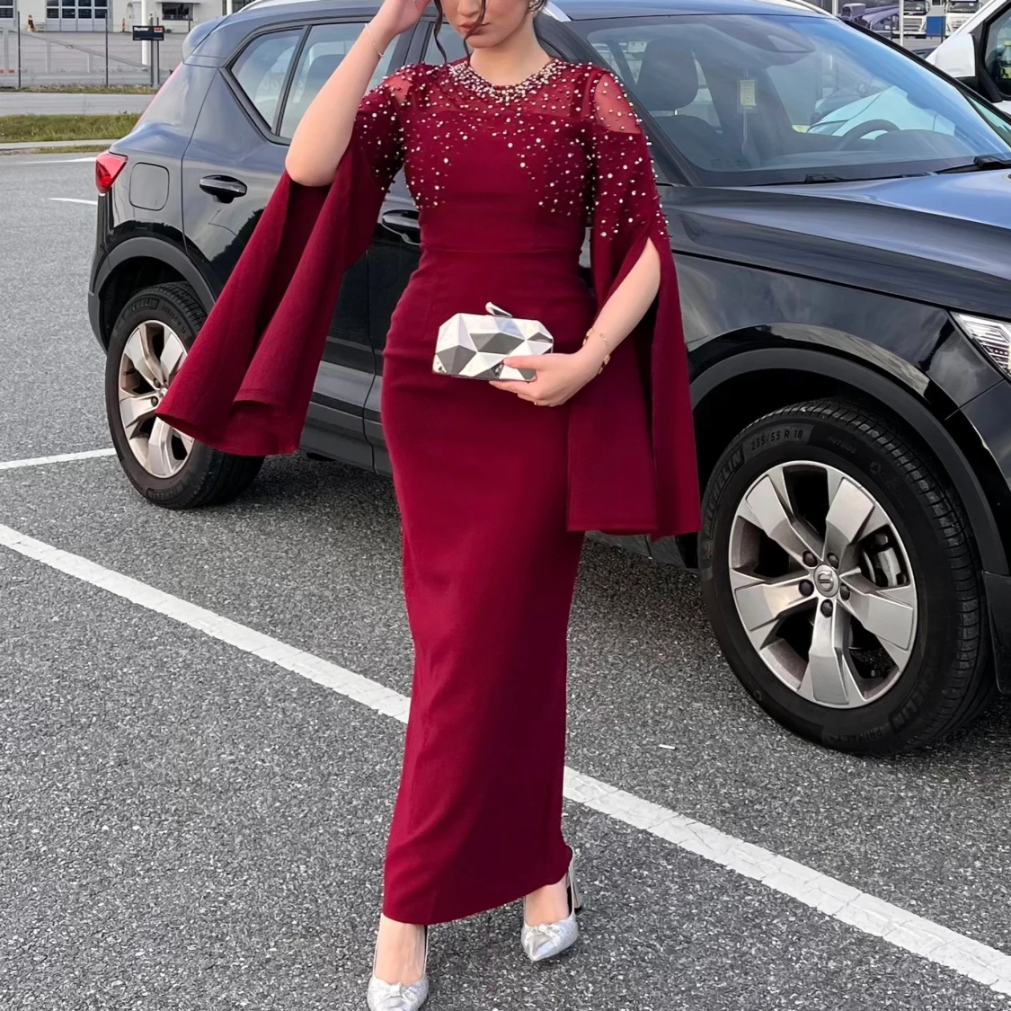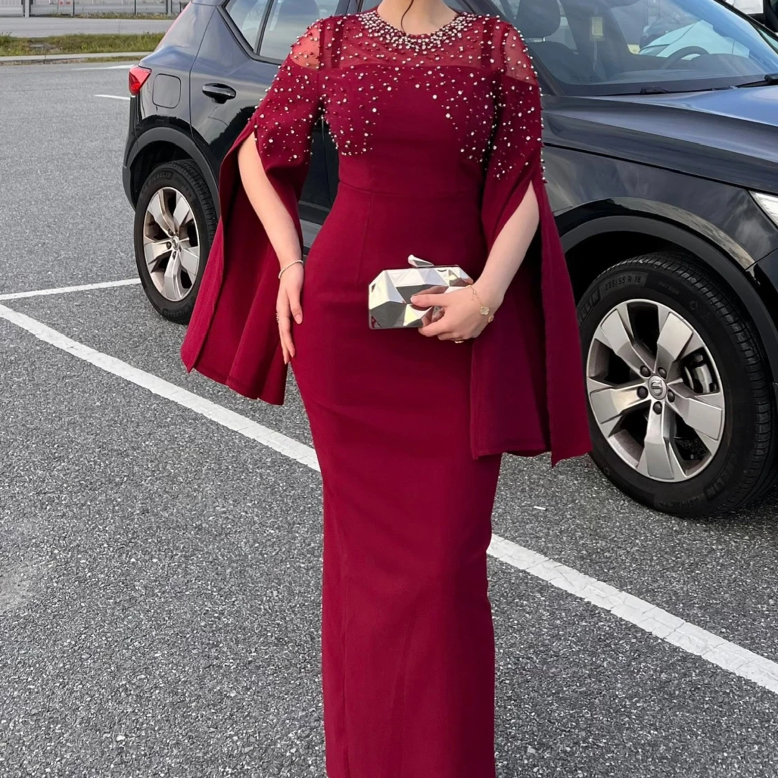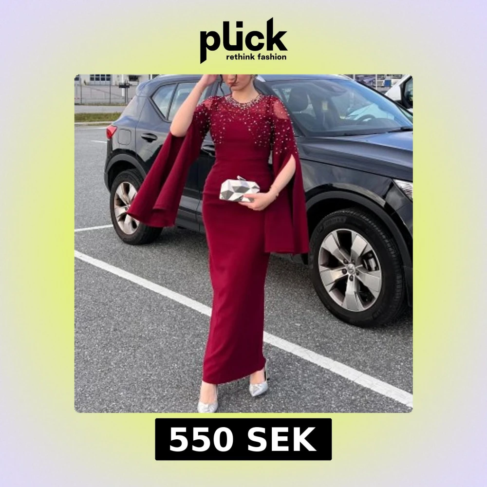 Supersnygg vinröd långklänning med capeärmar och pärldetaljer över axlar och bröst. Storlek 38, använt endast en gång i tre timmar och som ny! Klänningen har en figurnära passform och transparent mesh upptill. Perfekt för dig som vill sticka ut med en elegant och unik look.