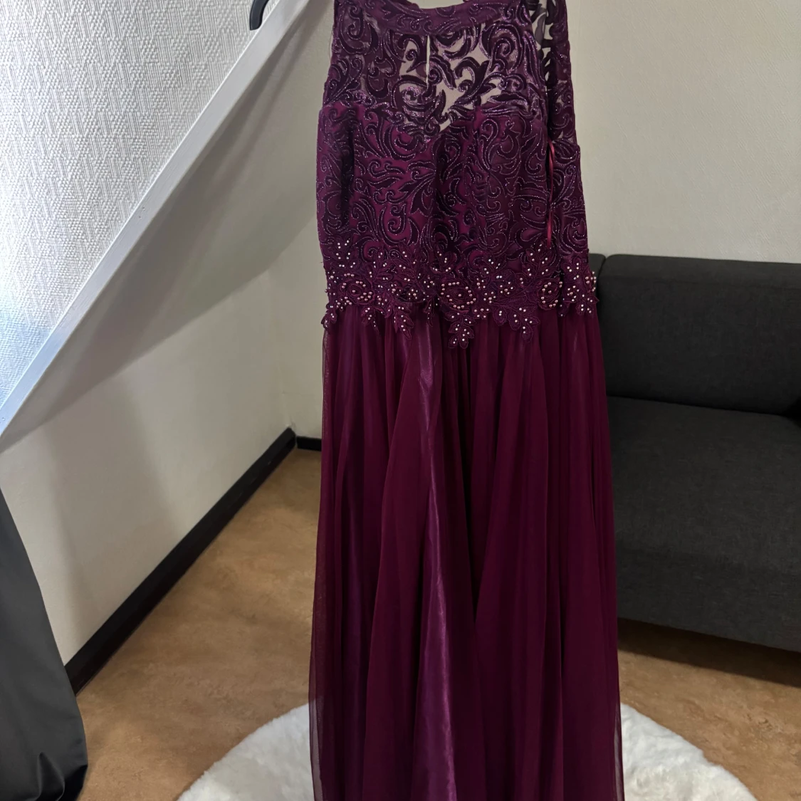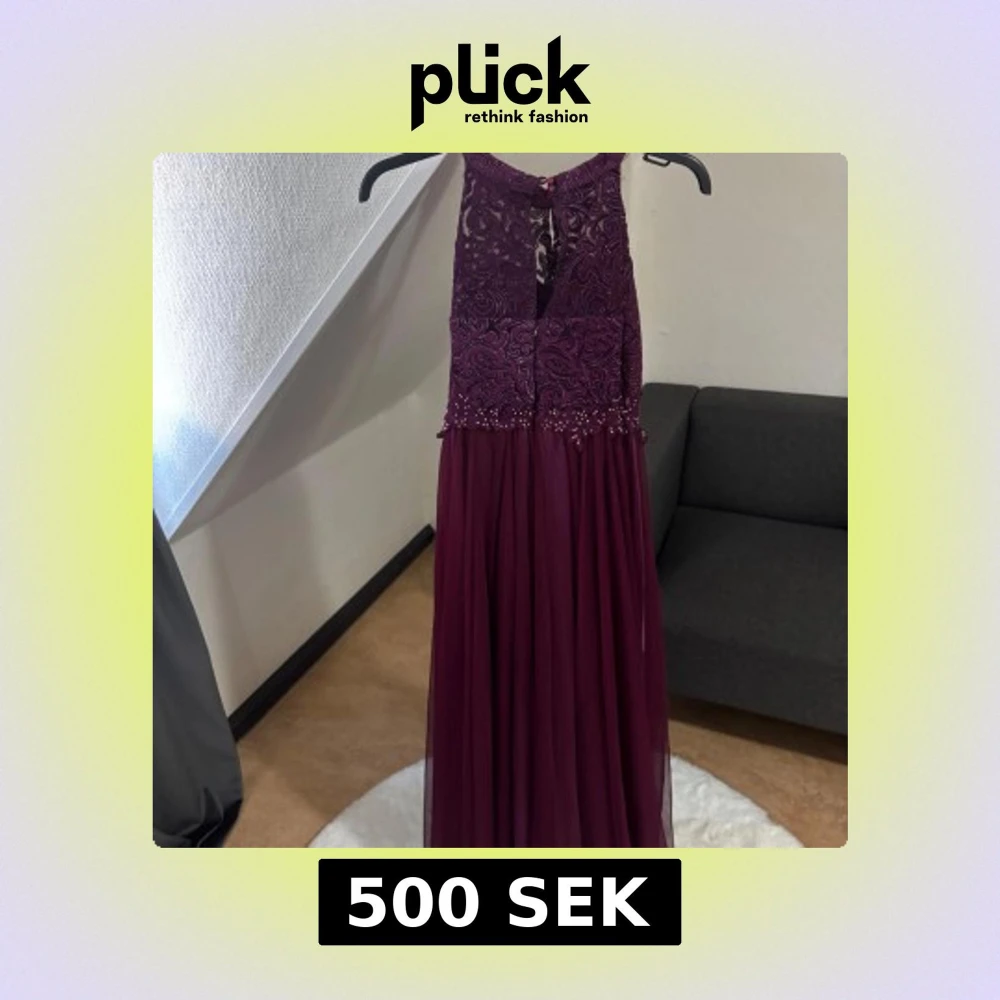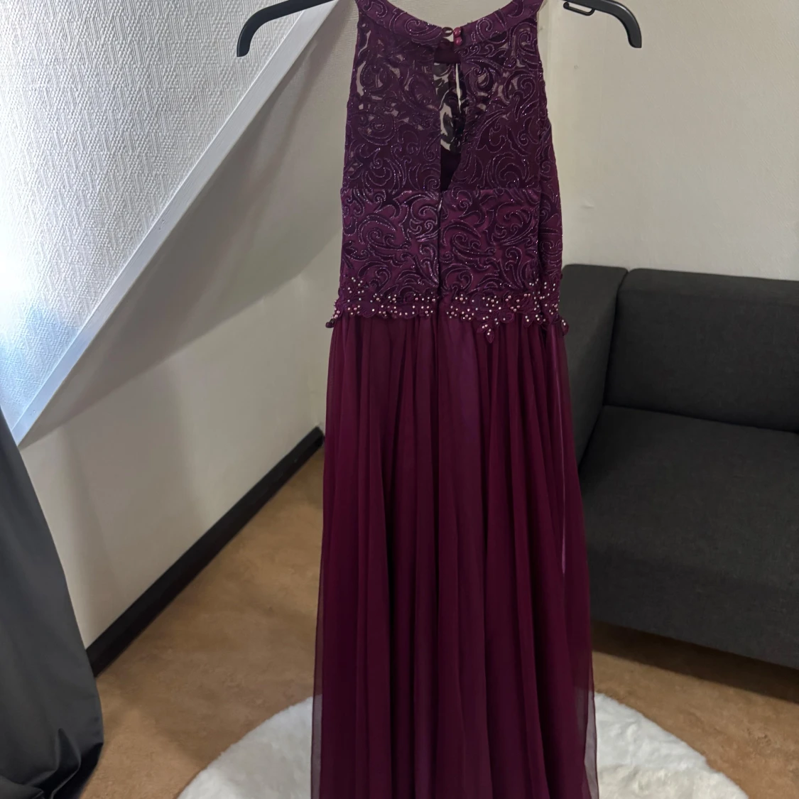 Magiskt snygg vinröd långklänning med spetsdetaljer och pärlor upptill. Klänningen har ärmlös design, öppen rygg och ett flowy kjolparti i tunt tyg. Perfekt för bal eller fest, med vackra broderier och elegant fall.