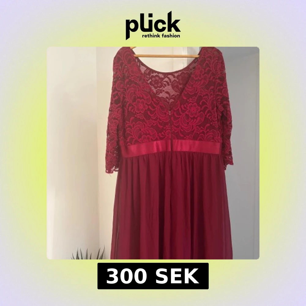 Vinröd långklänning med vacker spets upptill och halvärmade ärmar. Klänningen har ett brett satinband i midjan och en flowy kjol i tunt tyg. Blommigt spetsmönster ger en romantisk vibe och den djupa v-ringningen bak gör den extra elegant.