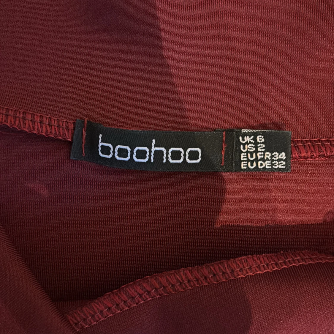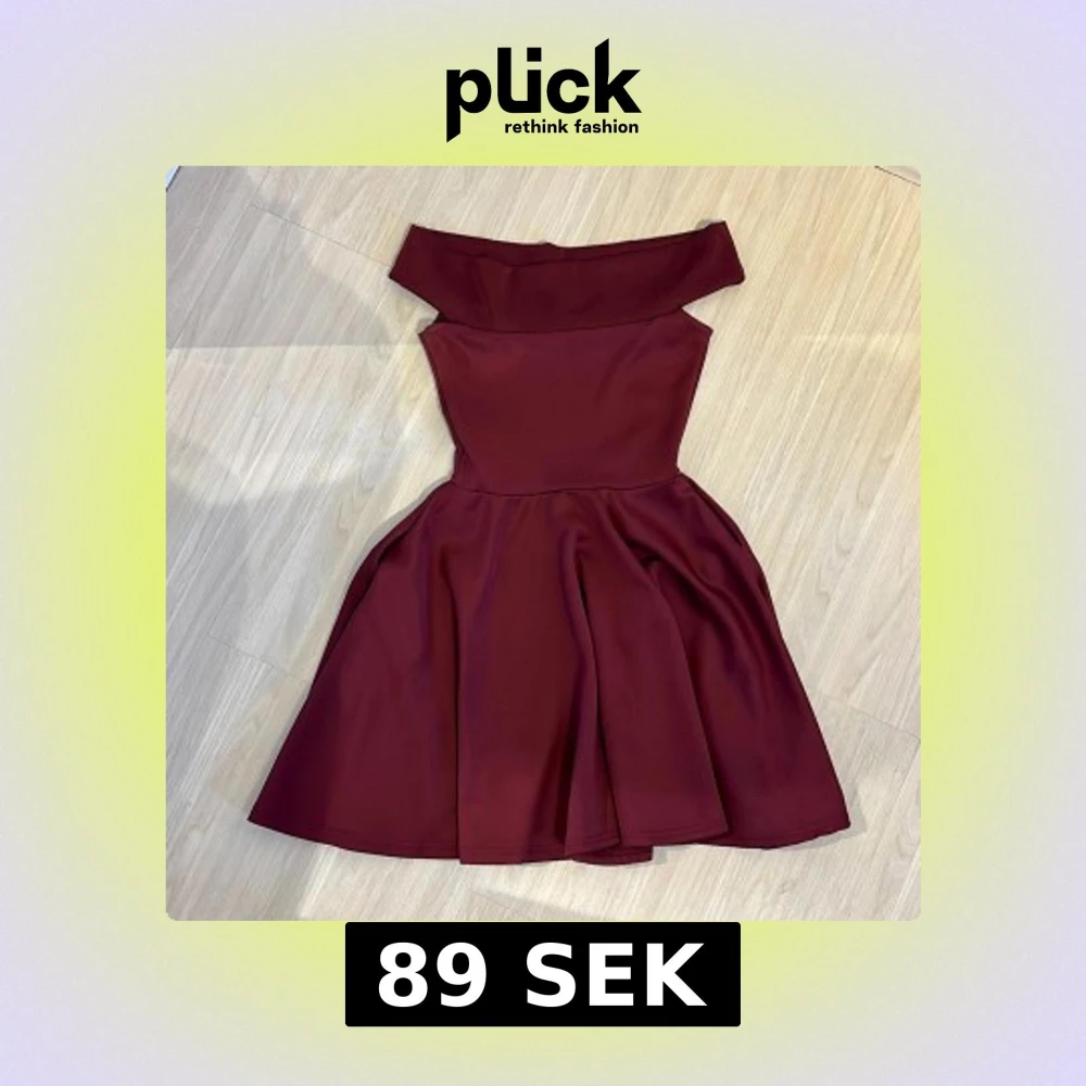 Supersnygg vinröd kortklänning från Boohoo med offshoulder-modell och utsvängd kjol. Klänningen har en tight överdel och markerad midja. Materialet är mjukt och följsamt, vilket gör den bekväm att bära.