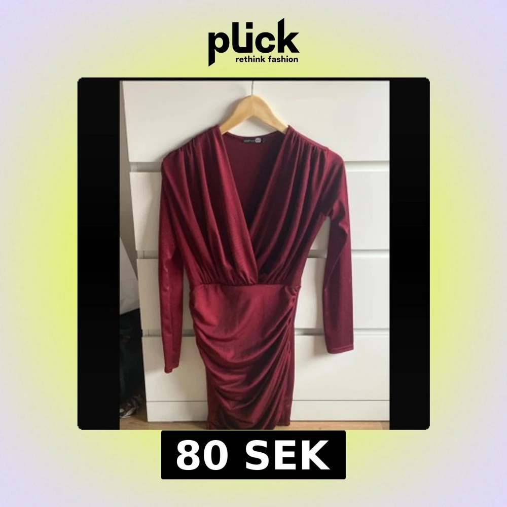 Snygg vinröd kortklänning från Boohoo med omlottmodell och v-ringning. Klänningen har långa ärmar och draperad kjol som ger en cool och trendig look. Perfekt för dig som vill sticka ut med en elegant men edgy stil.