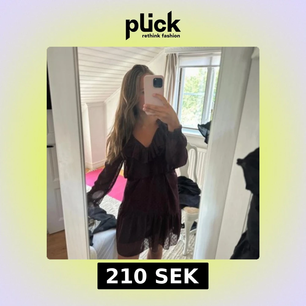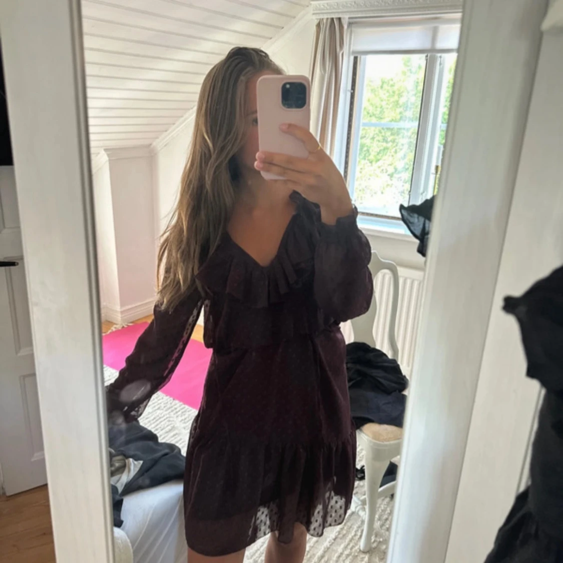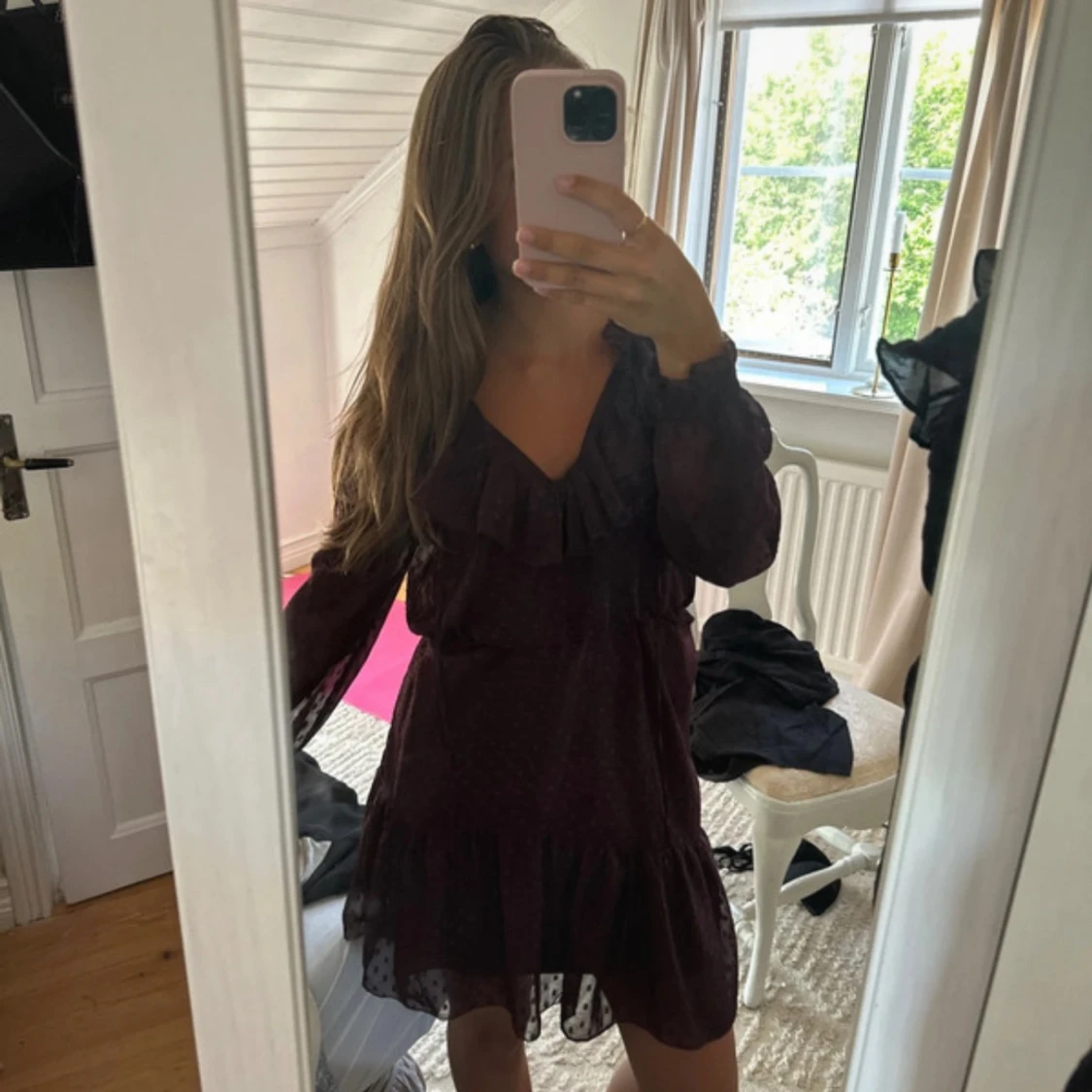 Vinröd kortklänning med prickigt mönster, v-ringning och volangdetaljer vid halsen. Långa ärmar i transparent tyg och resår i midjan för en skön passform. Perfekt för dig som gillar romantisk och trendig stil.