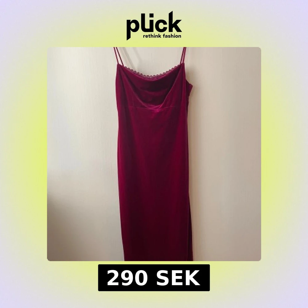 Elegant vinröd klänning i mjuk sammet med smala axelband och en subtil spetsdetalj vid halsringningen. Perfekt för en stilfull kväll. Färgen varierar lite beroende på ljus, kan dra sig mer vinrött, rosa eller lila. Ser lite mer lila ut i verkligheterna jämfört med bilderna. Passform: Längden går till några centimeter under knäna på mig som är 172cm lång. Stretchigt material förutom under delen vid bysten som är mer av ett silkes material, ungefär som en inbyggd bh.