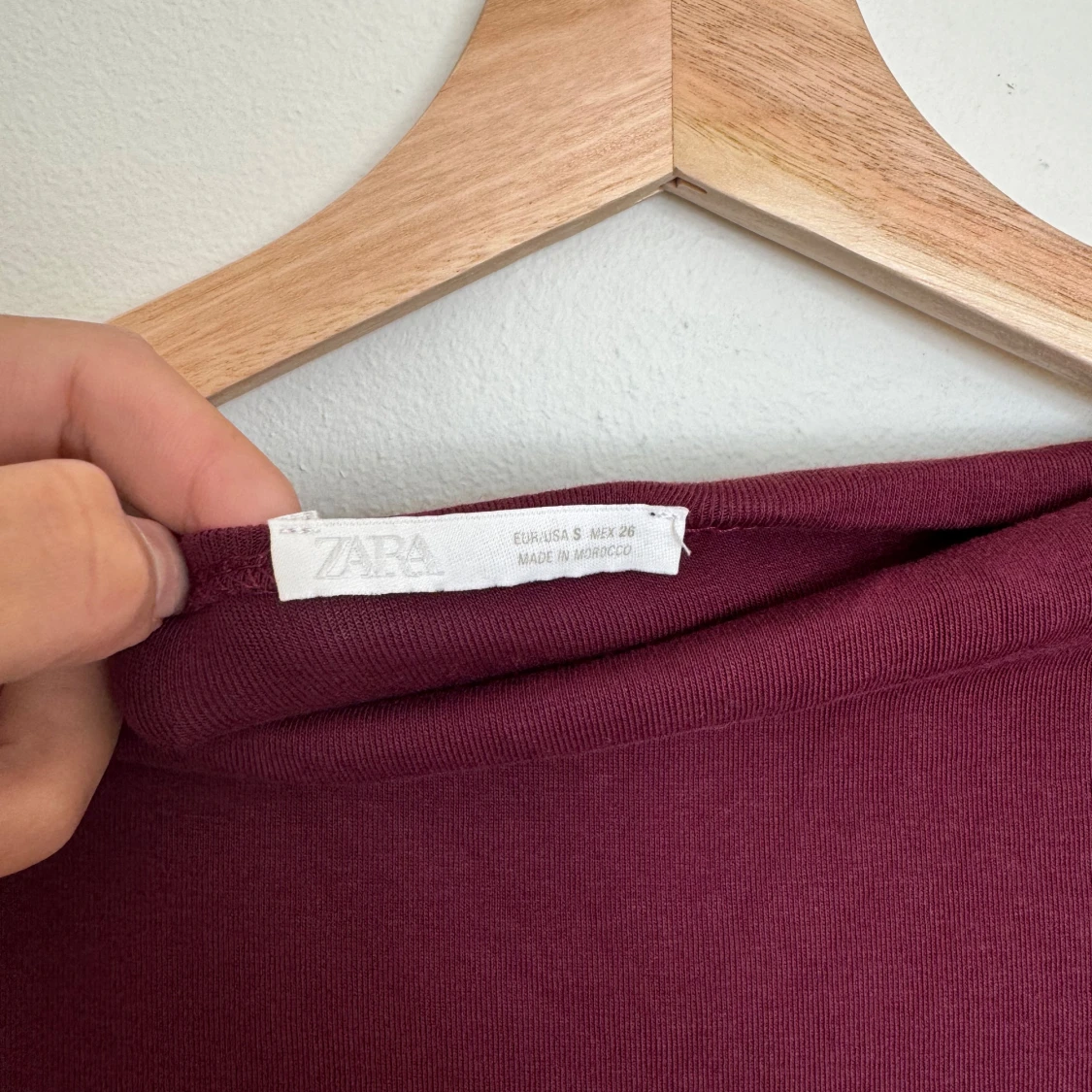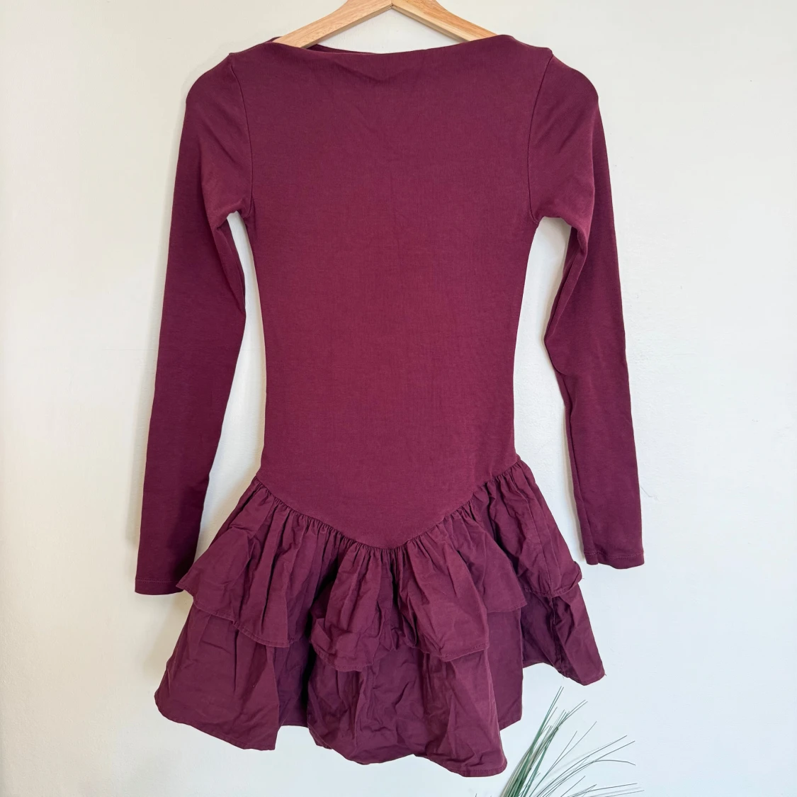 Vinröd klänning med volangkjol. Klänningen har en figurnära överdel och två lager volanger nedtill.