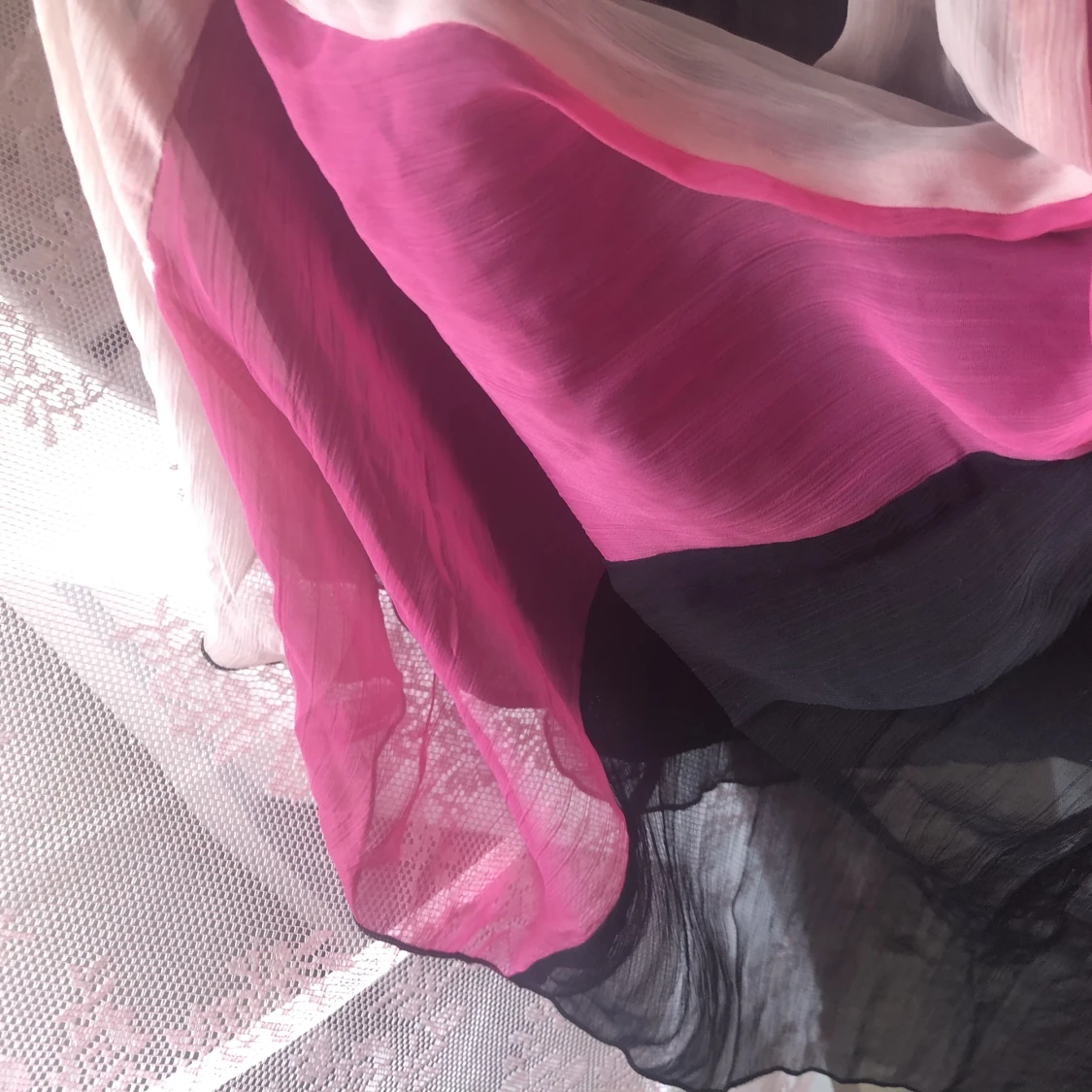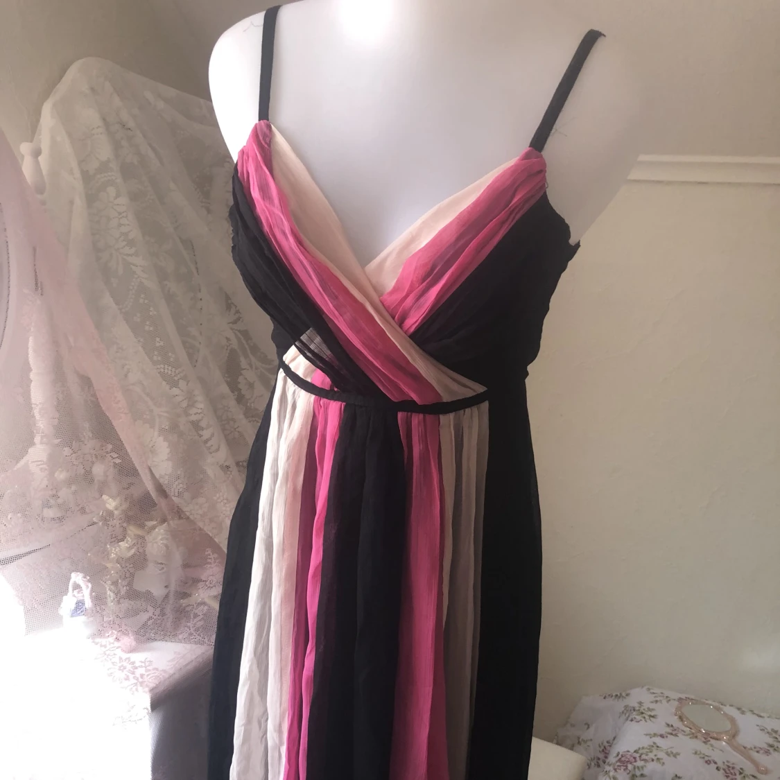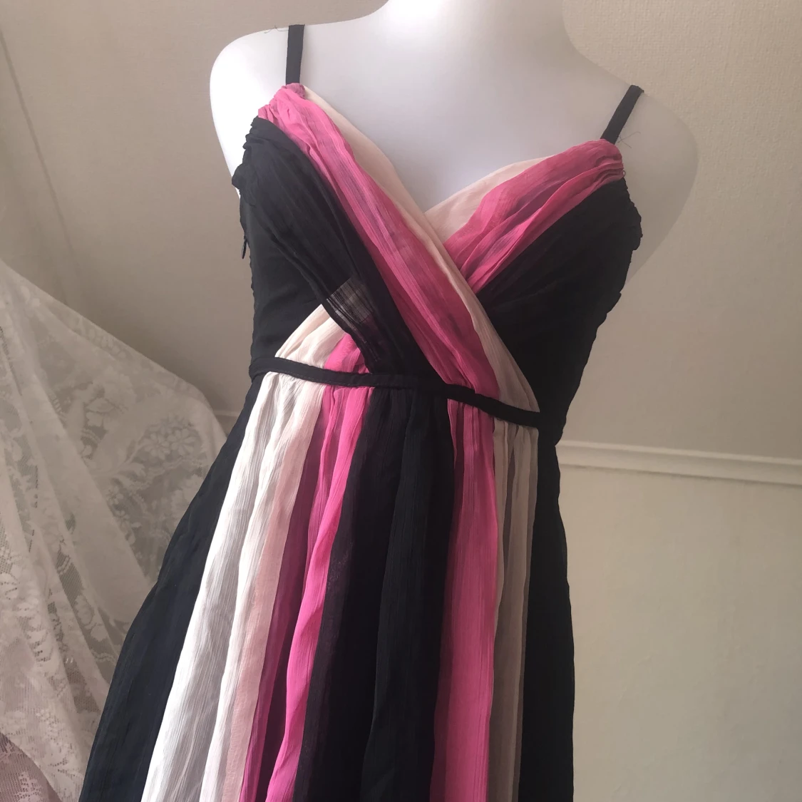 Rosa/Svart klänning i ett lent meshliknande material, väldigt flowy å fin i vinden/rörelse, så mysig å ha i sommar! Endast testad säljer pga fel storlek. Storleken är lite större än xs men mindre än s? Från typ 2010 så svår att få tag på. Läs gärna bio<3