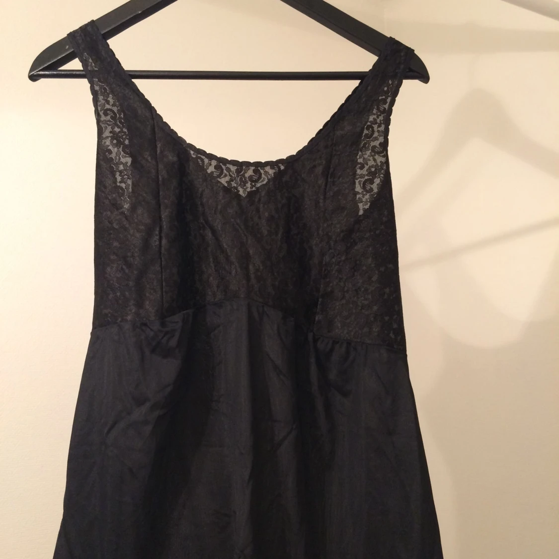 Svart klänning i tunt material med spets över bröst.