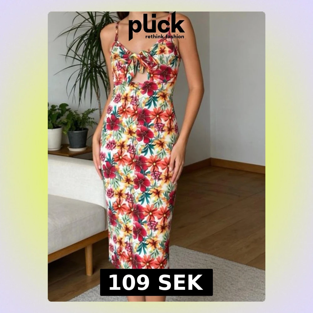 Färgstark blommig klänning med smala axelband och snörning framtill. Klänningen har en kroppsnära passform och går till knäna. Mönstret består av röda, gula och gröna blommor på vit botten. Perfekt för sommarens alla tillfällen.