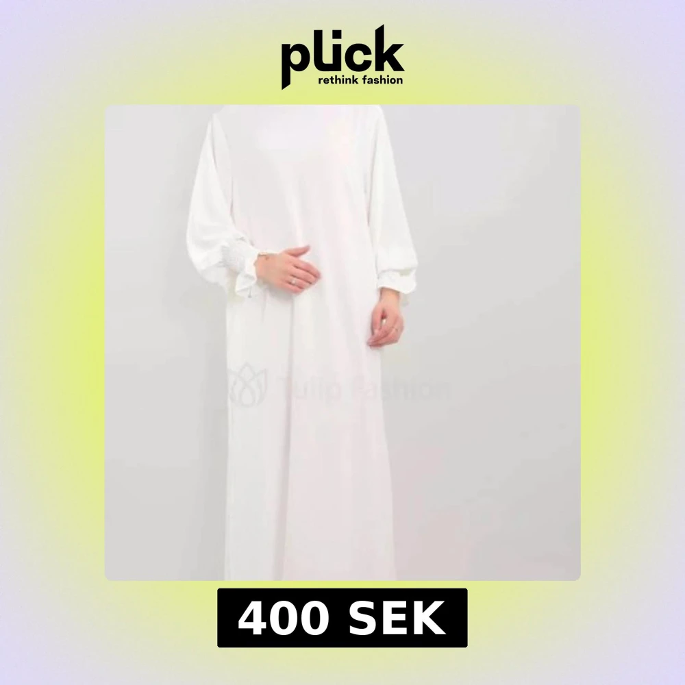En stilren vit abaya med vida, långa ärmar och smockdetalj vid ärmsluten. Abayan är köpt på Tulipfashion. Jag har kortat abayan så den passar längden 155-165 cm.