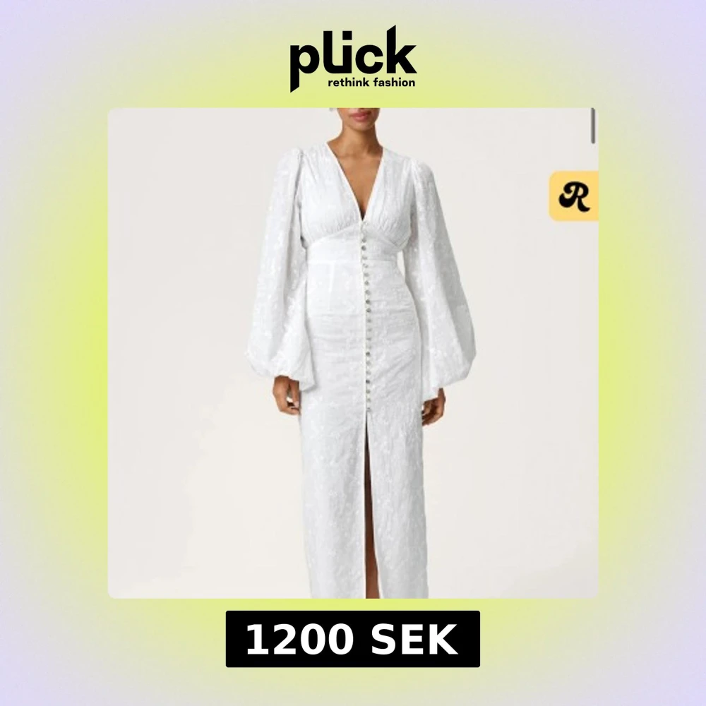 Superfin vit långklänning med v-ringning, puffiga långärmar och knappar framtill. Klänningen har broderade detaljer och en slits framtill som ger en elegant look. Perfekt för dig som vill sticka ut med en romantisk och trendig stil.