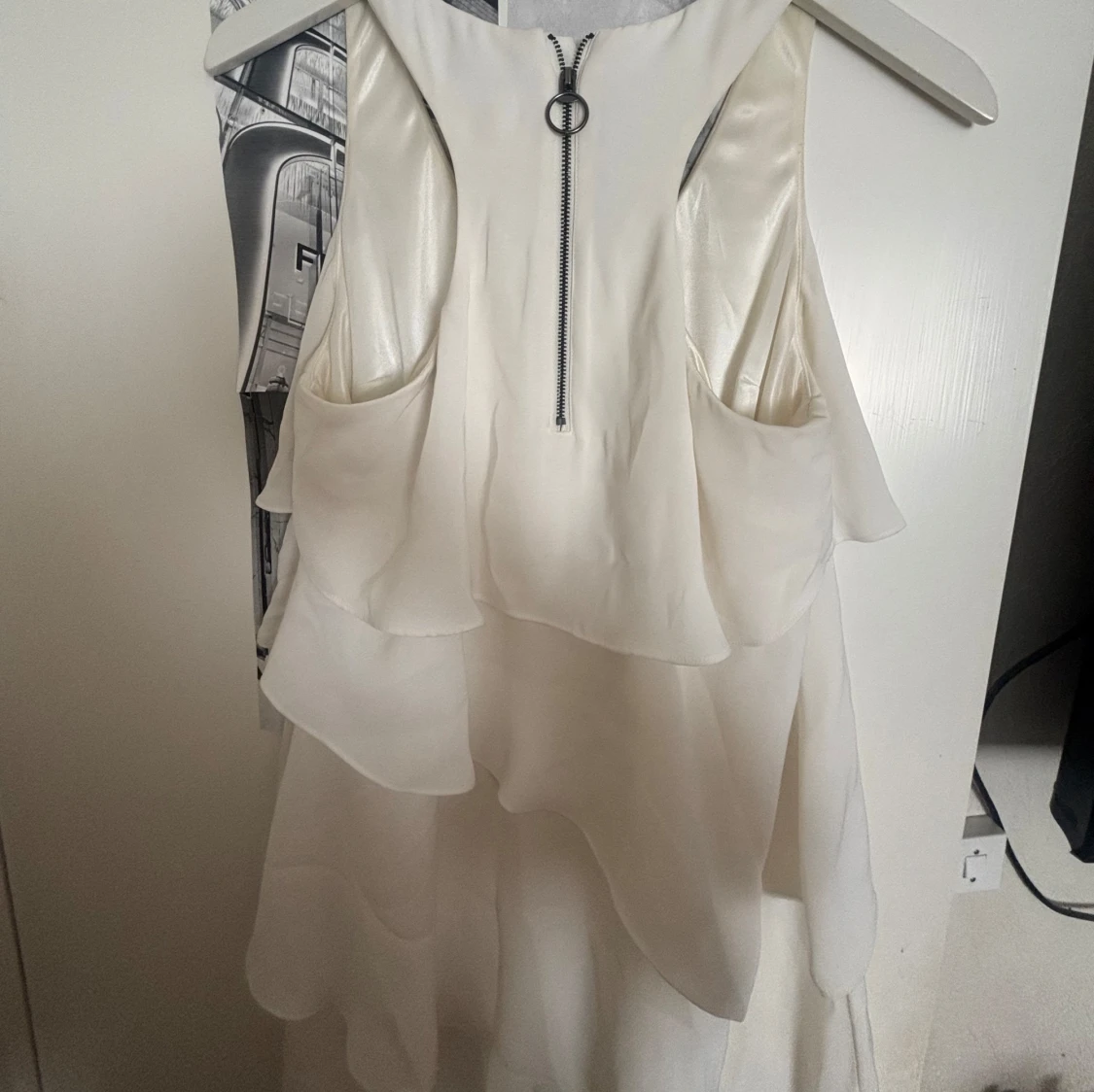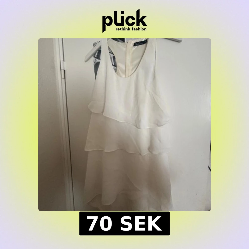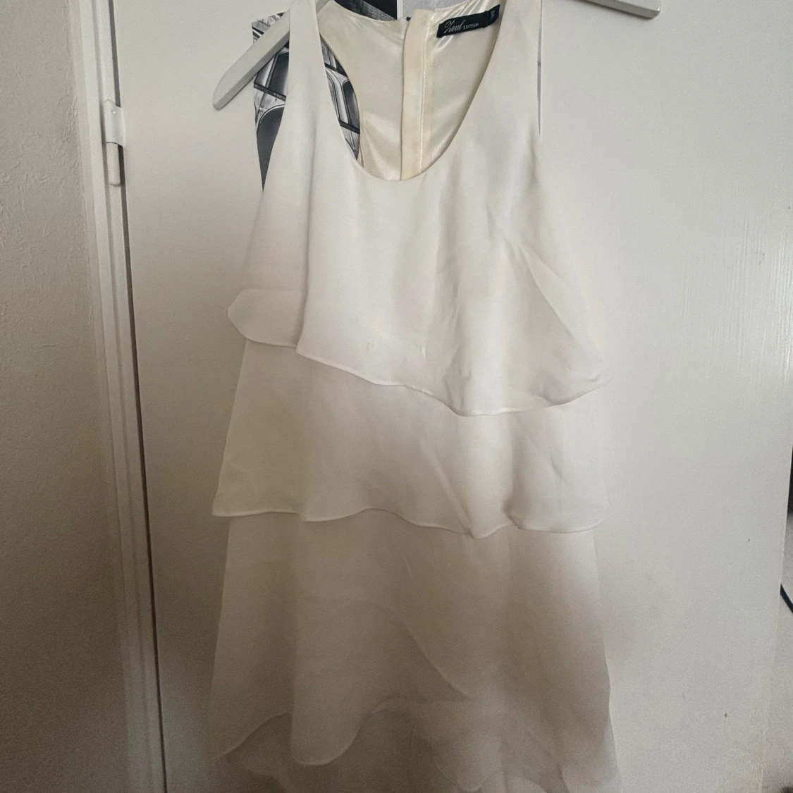 Säljer en stilren vit ärmlös klänning med lager-på-lager design. Klänningen har en dragkedja i ryggen och en luftig passform. Perfekt för sommarens alla tillfällen!