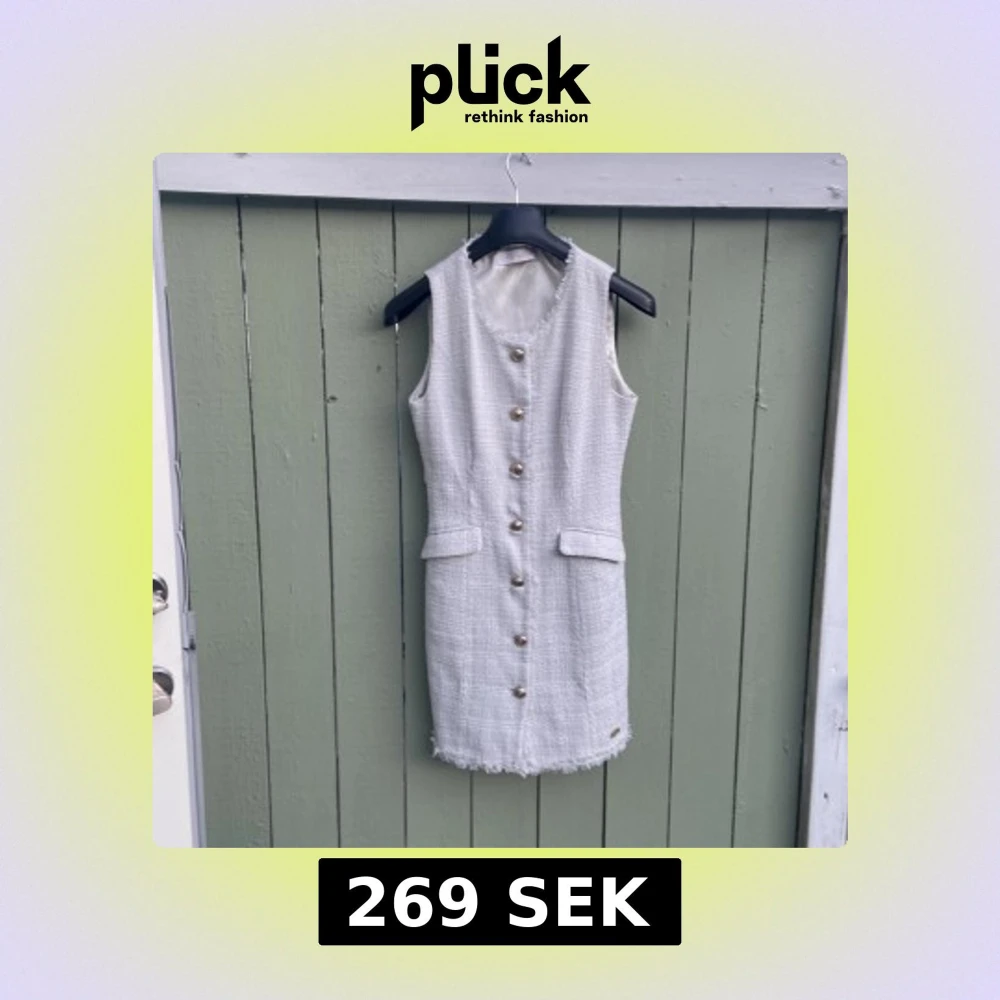 Supersnygg vit ärmlös kortklänning i strukturerat tyg med silvriga knappar framtill och två dekorativa fickor. Klänningen har råa kanter vid hals och nederkant för en cool touch. Passformen är normal och materialet känns som en blandning av bomull och syntet.storlek passar 37-40. Lite har sprättat nedanför bröstet har sytt det syns inte mycket.kan skicka bilder