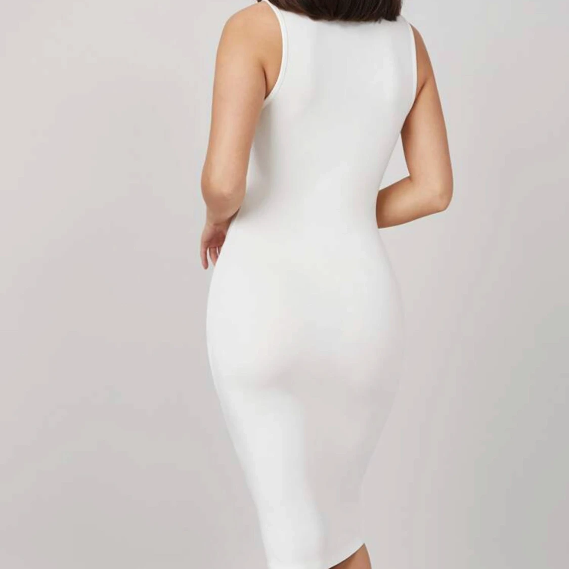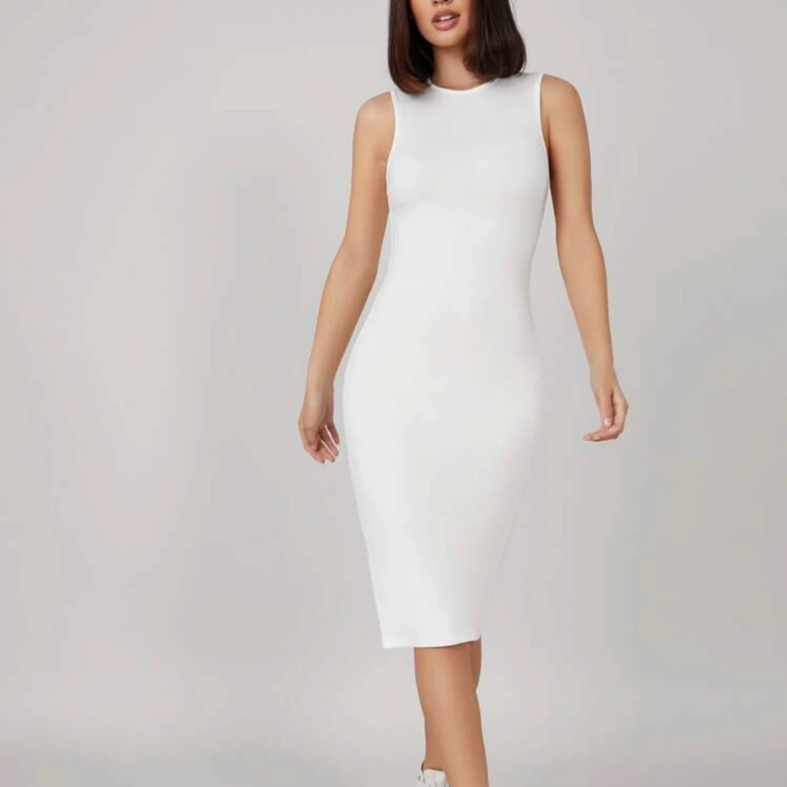 Säljer en stilren vit klänning i tight passform med ärmlös design och rund hals. Klänningen är knälång och har en minimalistisk look som är lätt att styla med sneakers eller klackar. Perfekt för dig som gillar enkel och modern stil.
