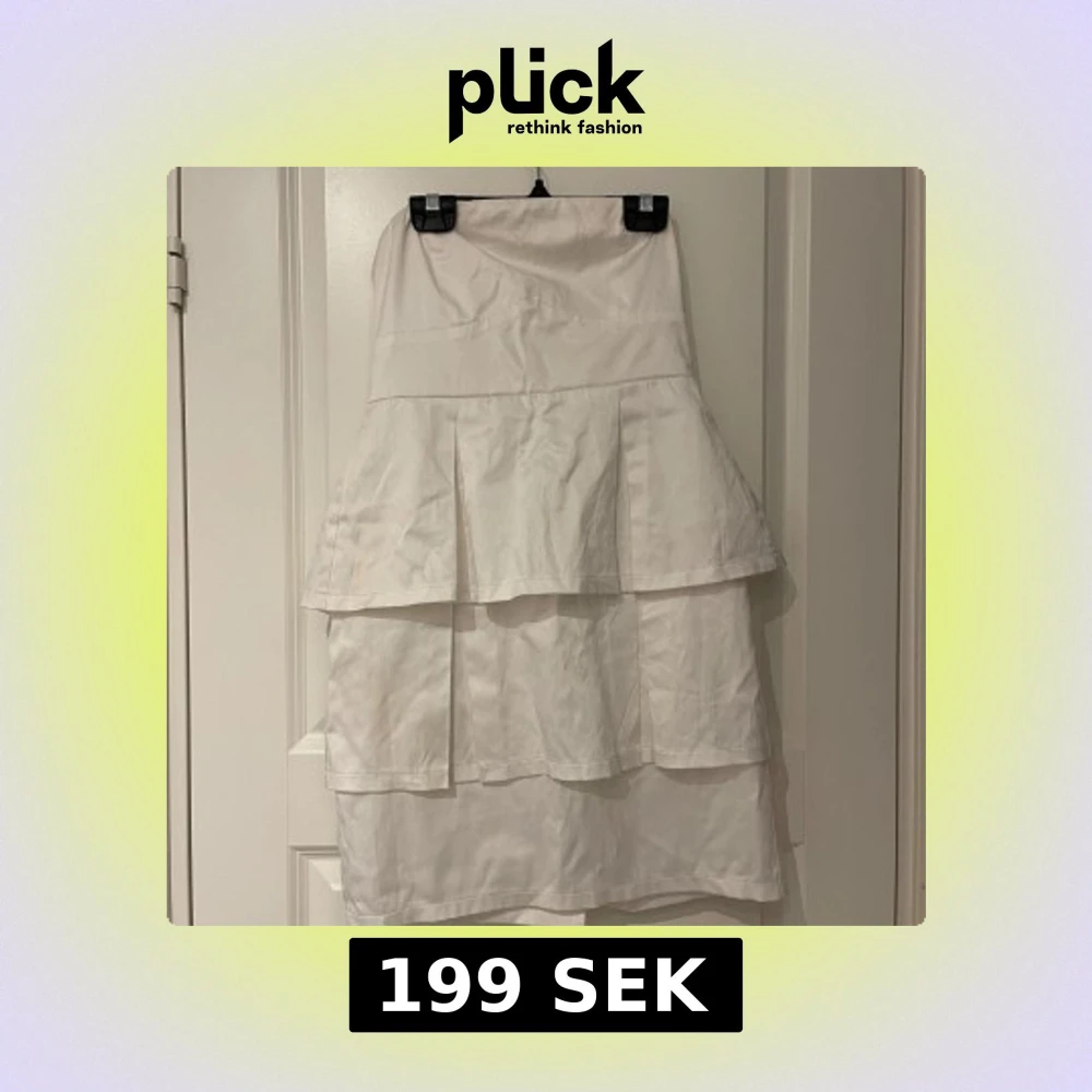 Säljer en vit axelbandslös klänning från Miss Etam med två lager volanger och dragkedja bak. Klänningen har en elegant och stilren design, perfekt för sommarens tillfällen. Materialet känns mjukt och har en lätt glans.