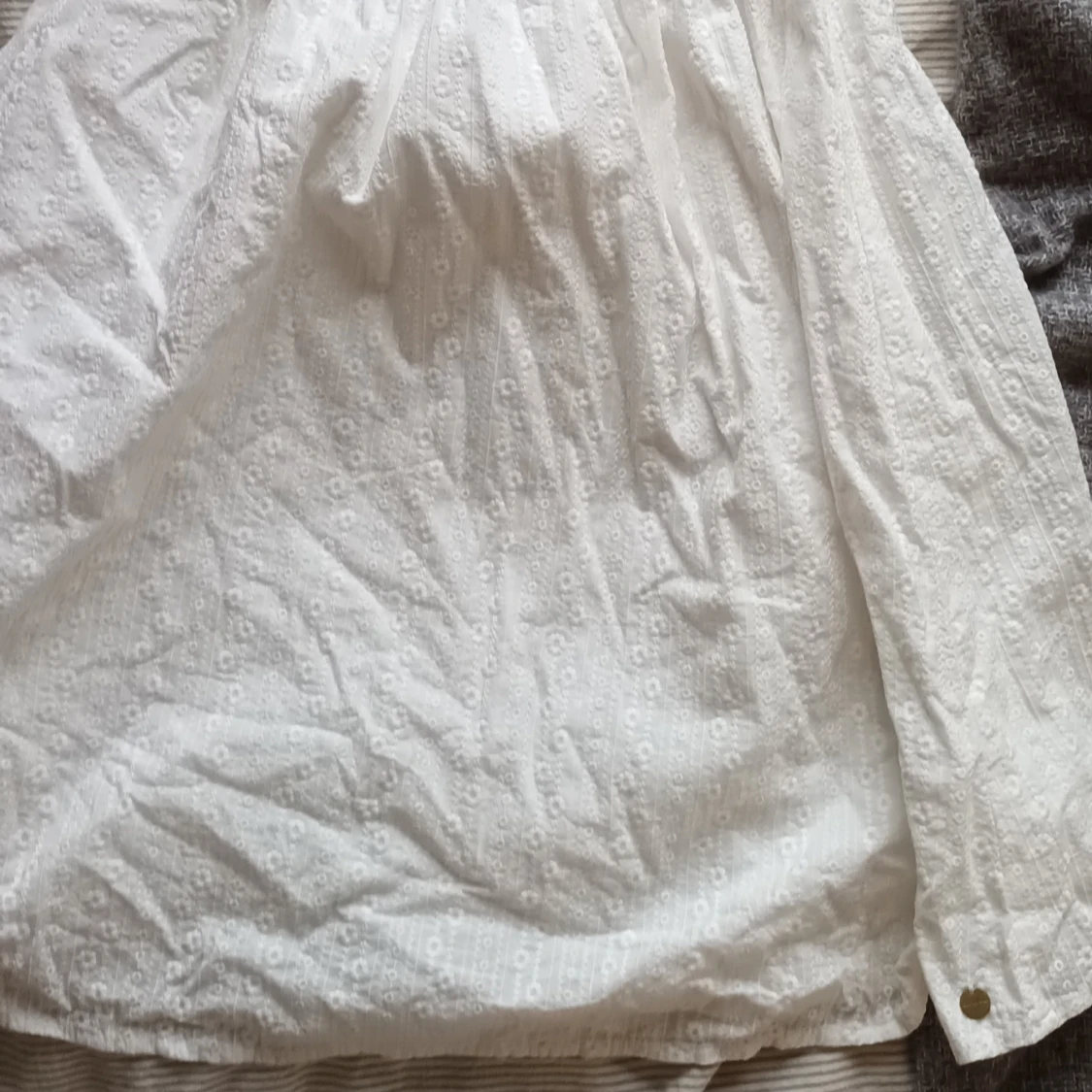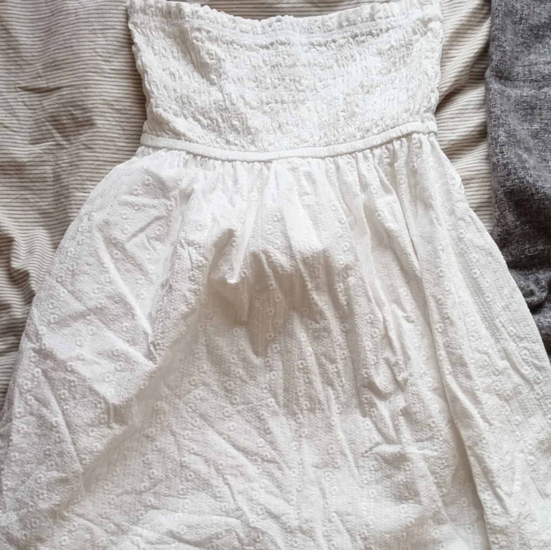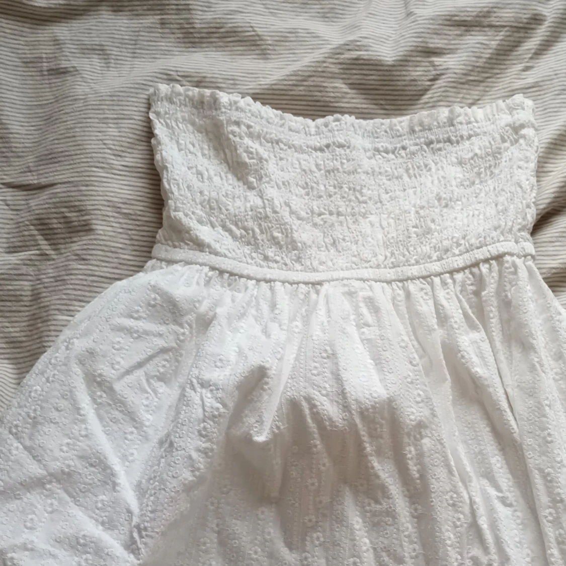 Supersöt vit axelbandslös kortklänning med broderade blommor och smock upptill. Klänningen har en liten guldfärgad logoknapp nertill och är gjord i bomull, perfekt för varma dagar.