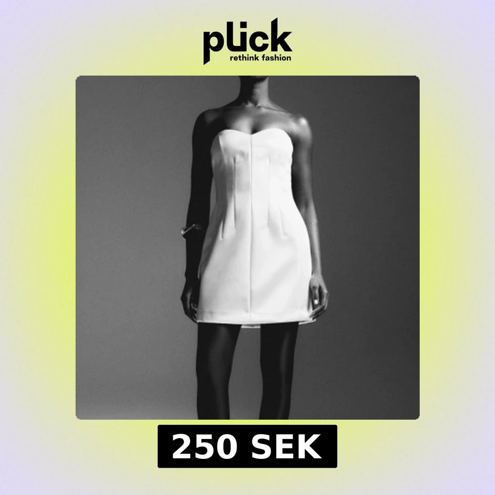 Säljer en stilren vit axelbandslös kortklänning med figurnära passform och markerad byst. Klänningen har en enkel, elegant design och är perfekt för dig som gillar minimalistisk stil. Materialet ser ut att vara slätt och något strukturerat.