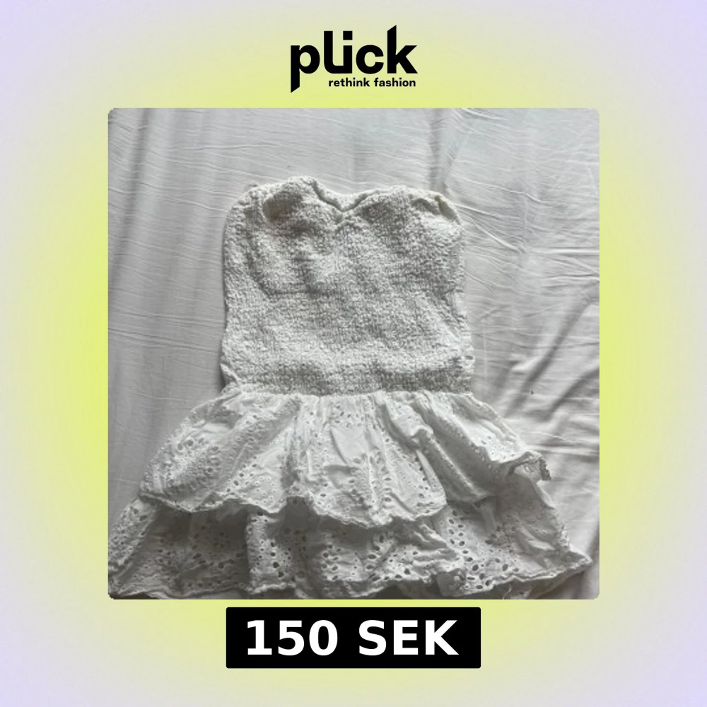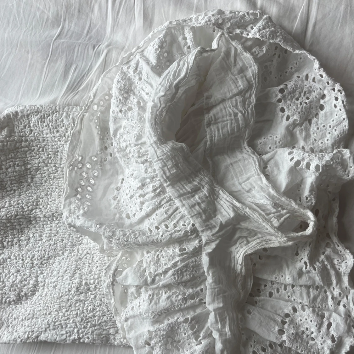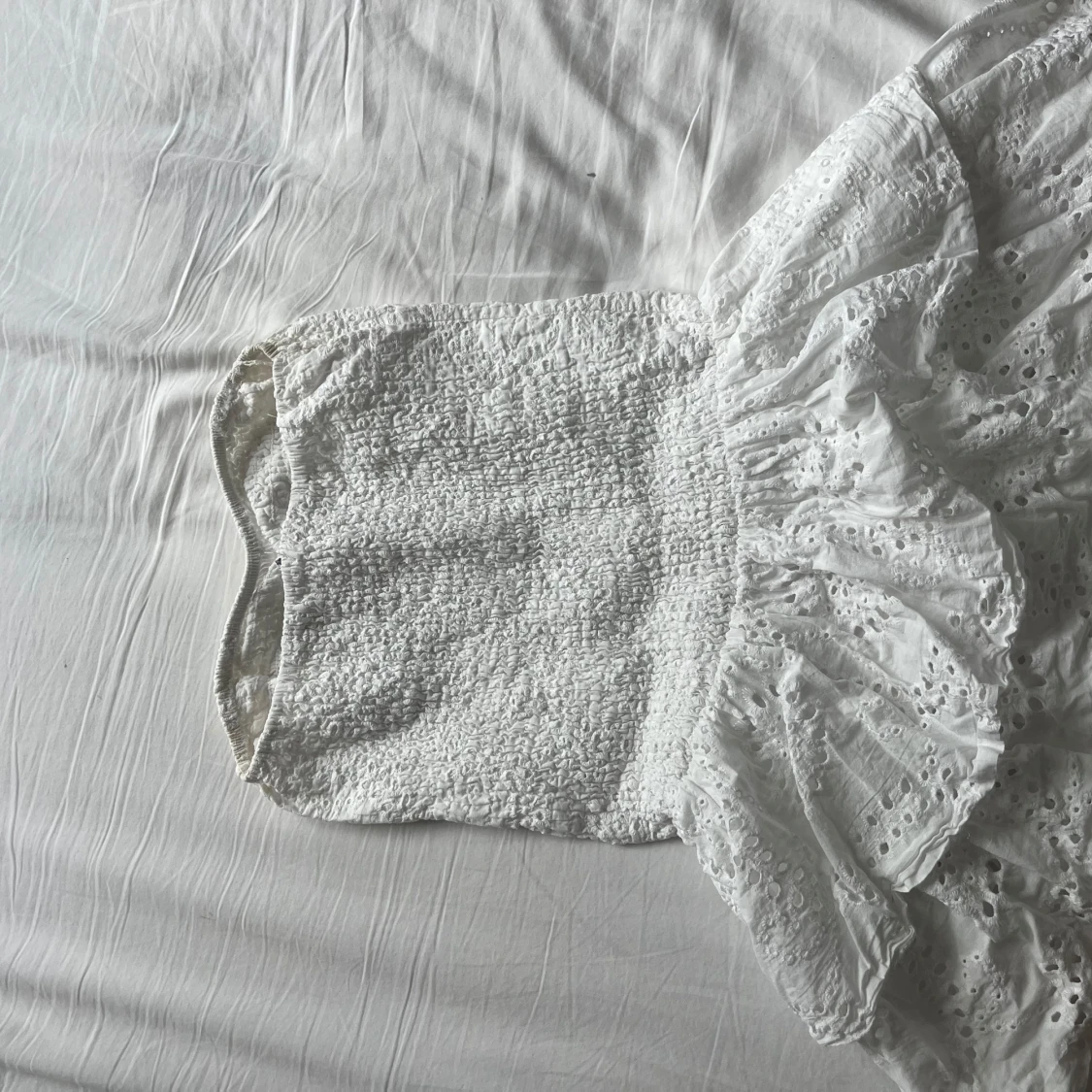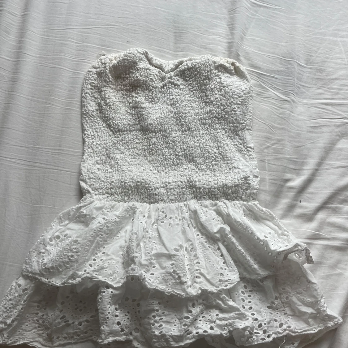 Supersöt vit axelbandslös kortklänning med smockad överdel och två lager volanger med broderade spetsdetaljer. Perfekt för sommarens alla tillfällen, med en luftig och romantisk vibe. Materialet är mjuk bomull som känns skönt mot huden. Den har även inbyggda shorts.