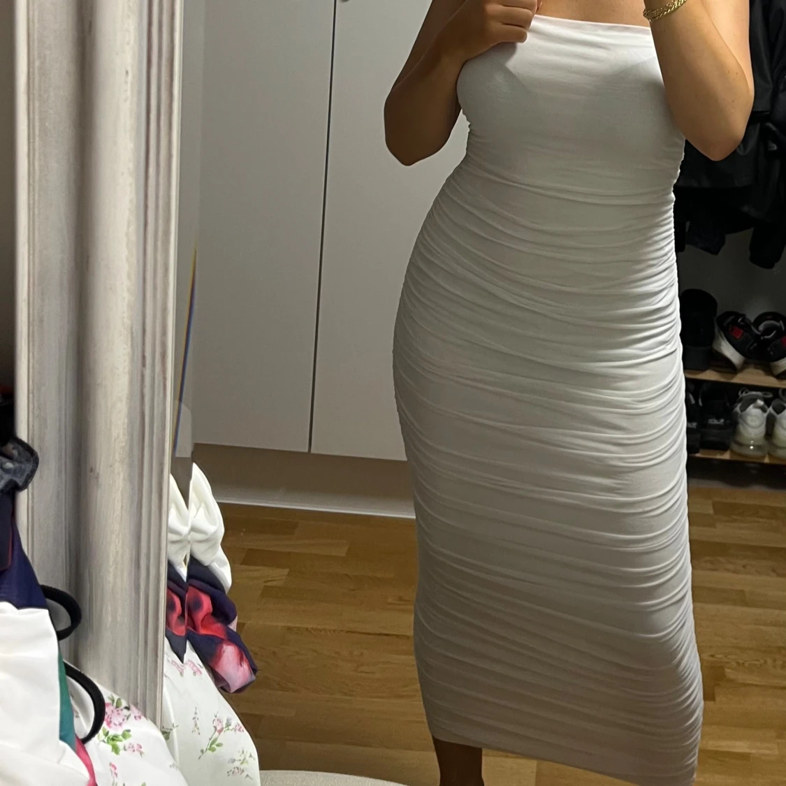 Säljer en vit, axelbandslös långklänning med tight passform och snygga rynkade detaljer längs hela klänningen. Perfekt för dig som vill ha en stilren och elegant look med en modern twist. Klänningen är figurnära och har en clean, minimalistisk vibe.